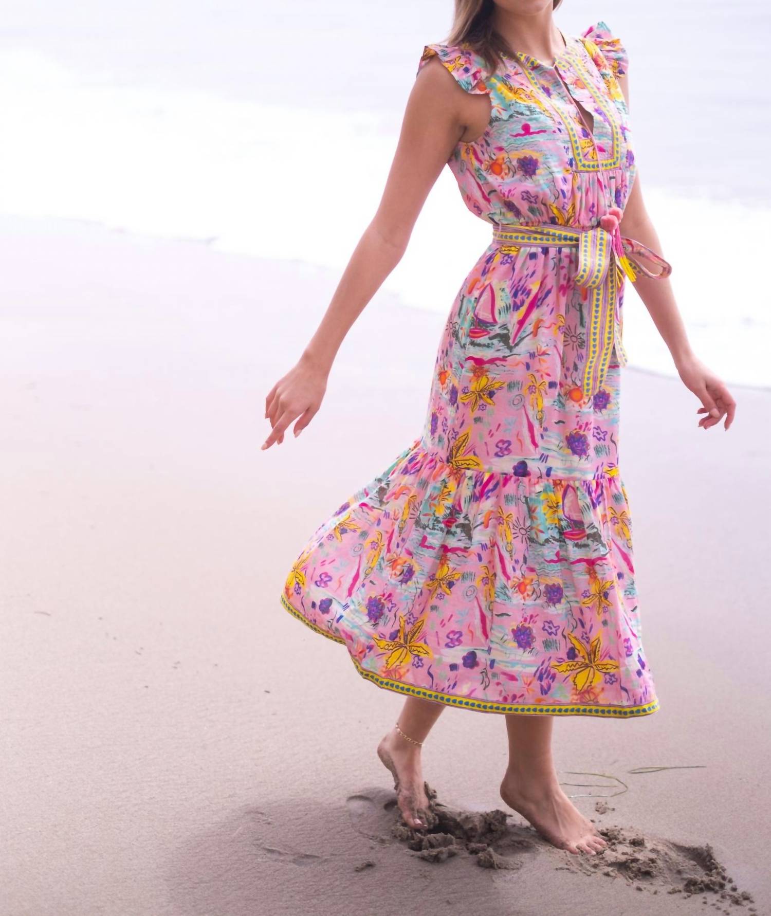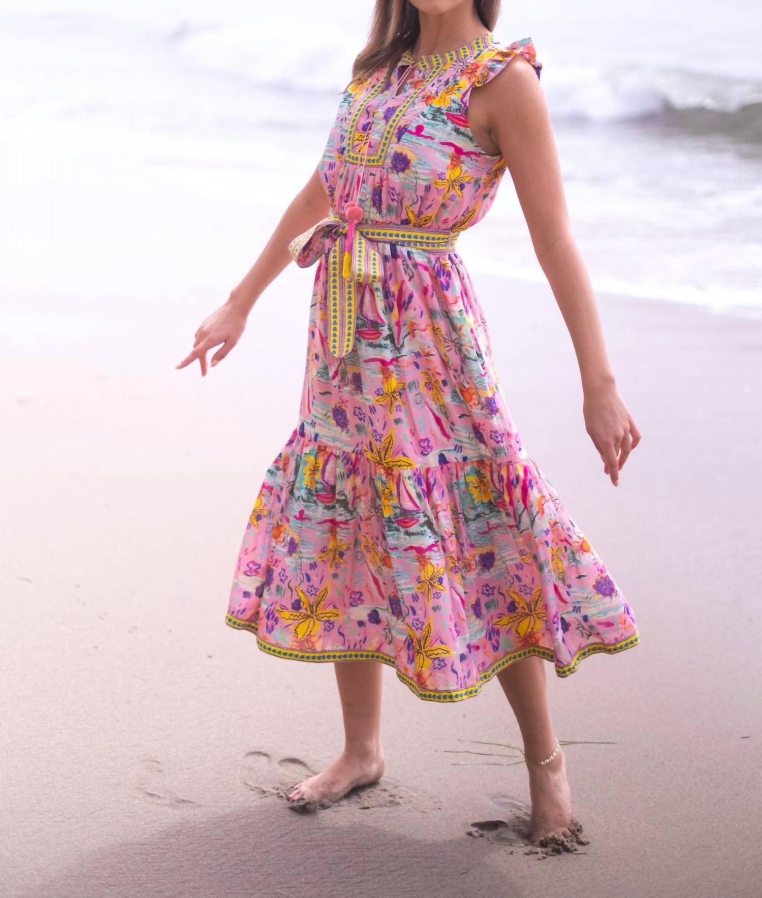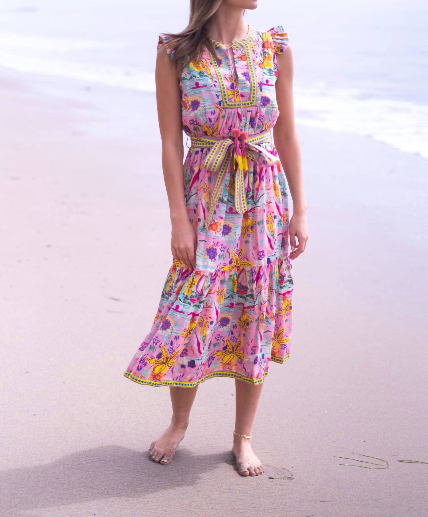The perfect length dress does exist. Introducing the Lola Midi Dress by Bell, a captivating blend of bohemian artistry and elegance in a Sunshine Print. This dress showcases delicate ruffle cap sleeves crafted from lightweight silk cotton voile, featuring a hand-blocked floral pattern and artisanal handmade tassels. Designed for vacation and Easter occasions, it offers a pull-on closure and midi length with an elastic waist for effortless, flowing movement. Care: Hand wash for maintaining its beauty and softness.