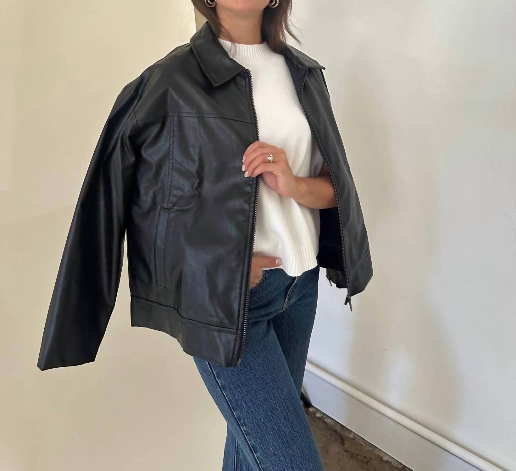 Everyone needs a leather jacket like this in their closet. This women's leather jacket features long sleeves with zipper accents and a chic collared v-neckline. Crafted from a blend of polyester and polyurethane, it boasts a zip closure and side pockets for practicality. Fully lined and imported, it should be hand washed for lasting quality. Model is 5'4" and wears a size small, ensuring a true-to-size fit.