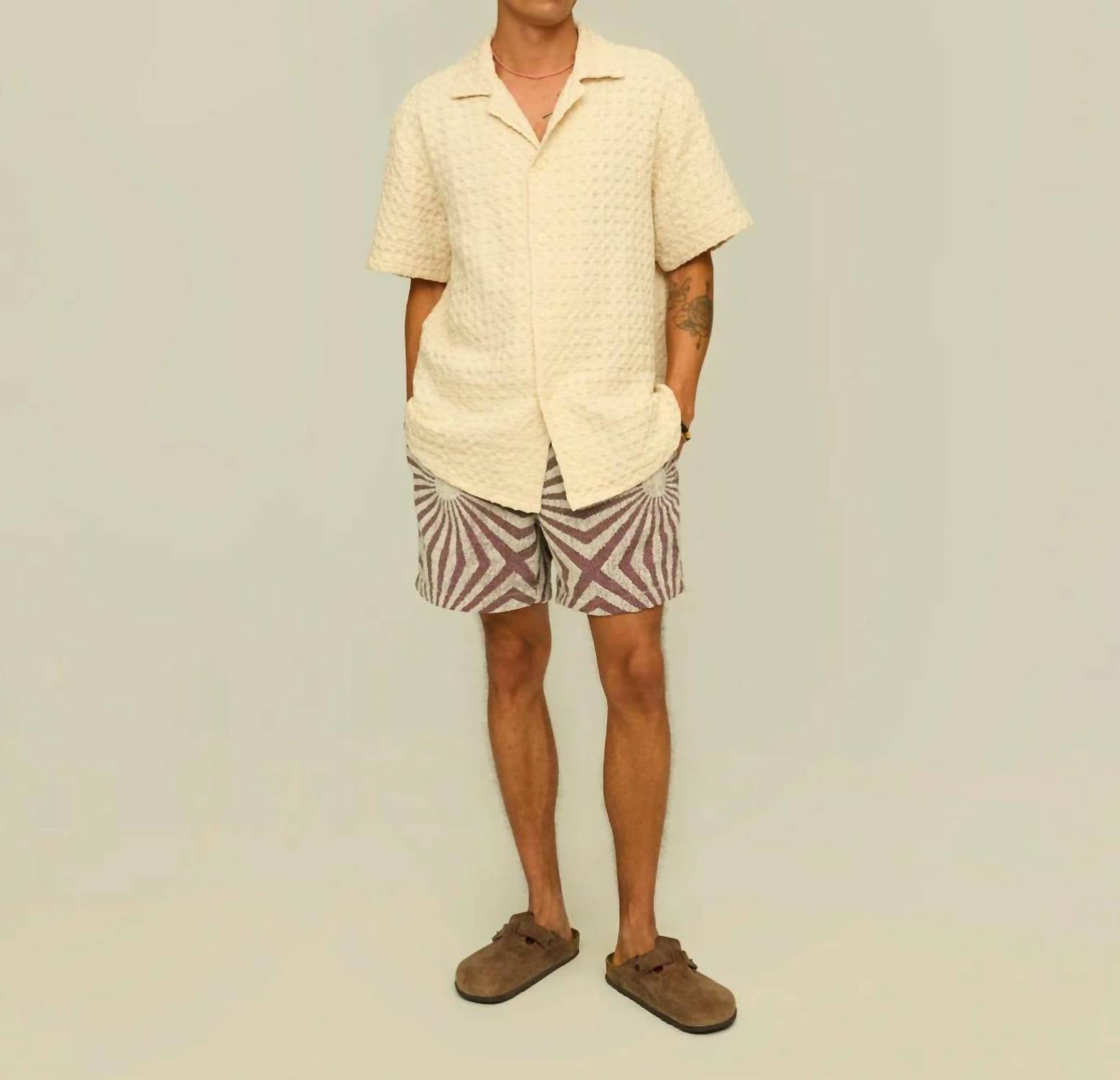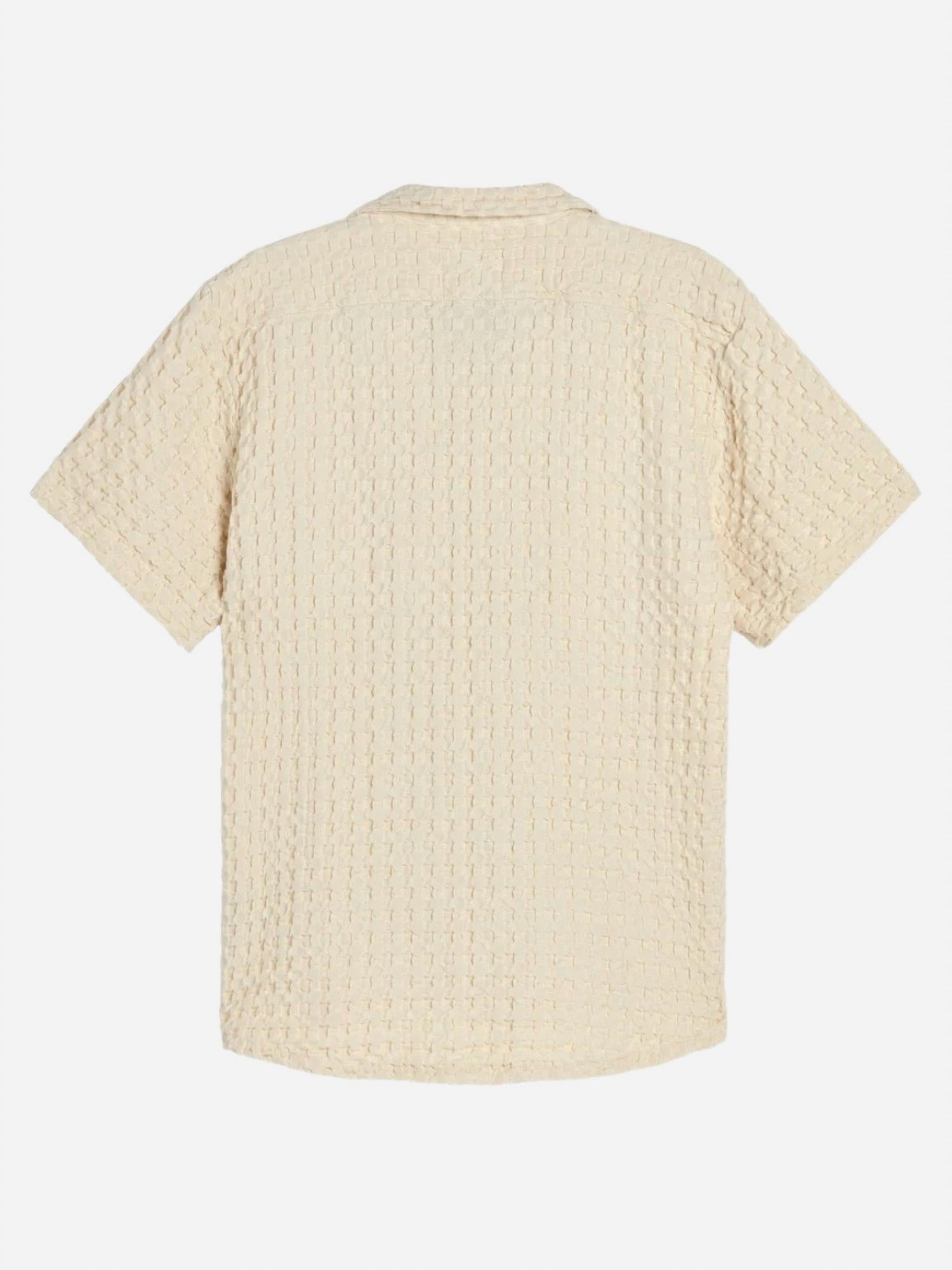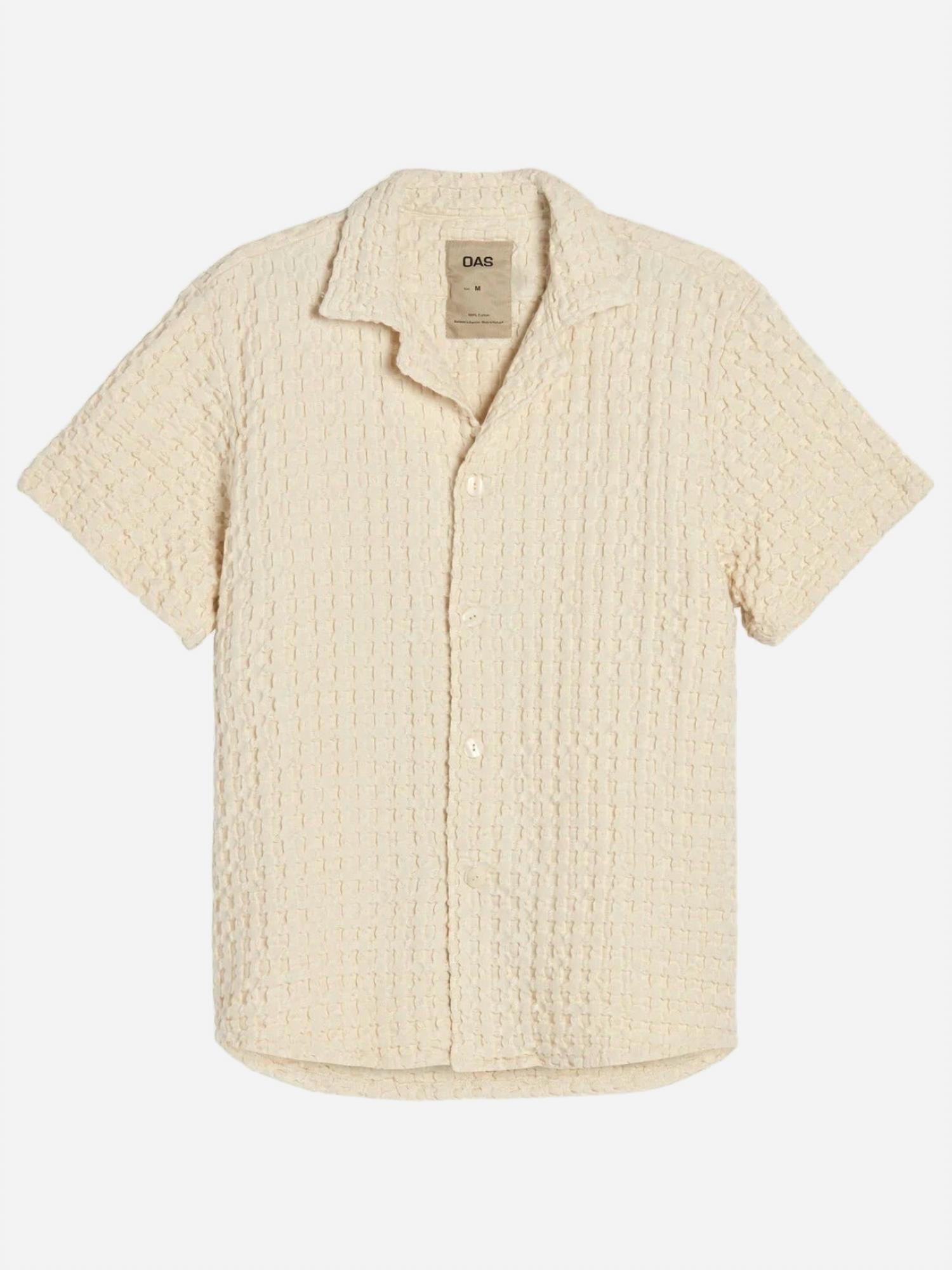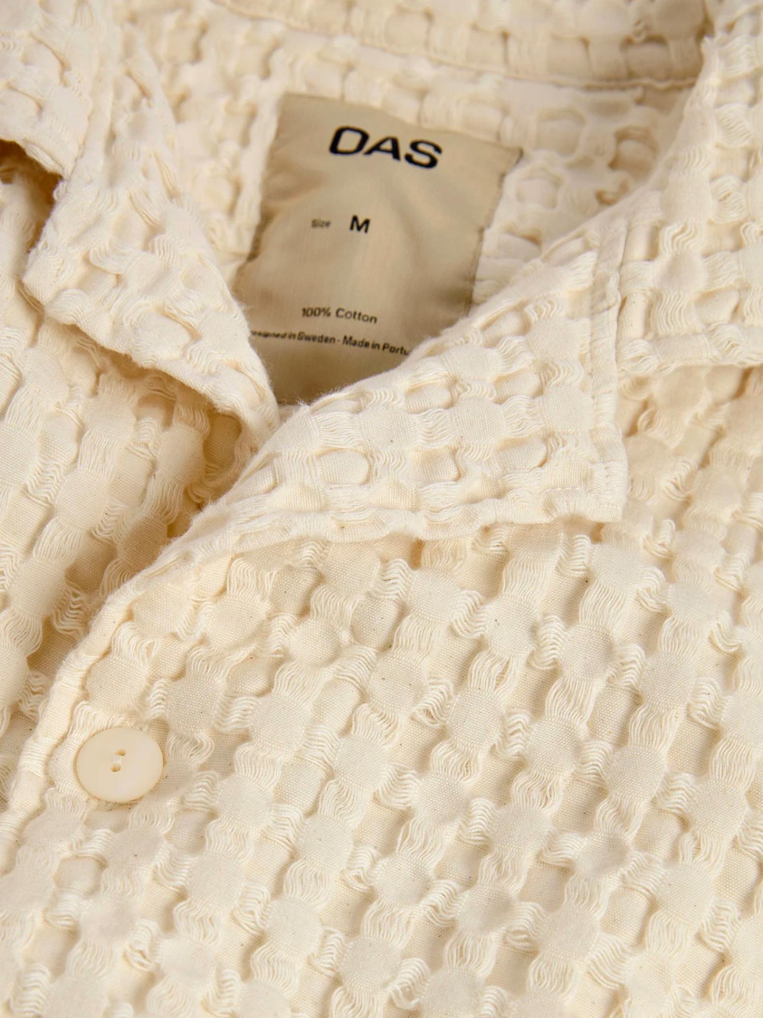 Discover the Ecru Cuba Waffle Shirt by OAS, a summer essential with short sleeves crafted from 100% unbleached cotton for a breathable feel. This textured, oversized shirt features a resort collar and button closure, perfect for vacation wear. Designed with attention to detail in Stockholm and made for quality in Portugal, it embodies both style and comfort. Ideal for casual outings, embrace a relaxed yet polished look with this vacation-ready staple.