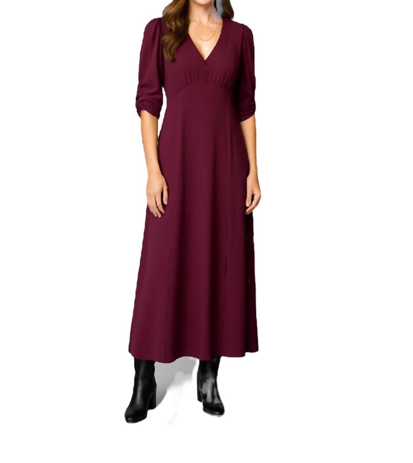 Casual, comfortable and cute! The dress that you'll be reaching for all season long. Discover elegance with the Pine Apparel Midi Length Dress in a stunning plum hue. Designed with three-quarter ruched sleeves, this A-line dress is crafted from 100% polyester with an air flow fabrication for a luxurious look and feel. It features a flattering V-neckline and a split straight hem, while the garment spans 51 inches in length, offering a graceful silhouette. Enjoy the convenience of a button closure and easily maintain its allure with machine wash care.