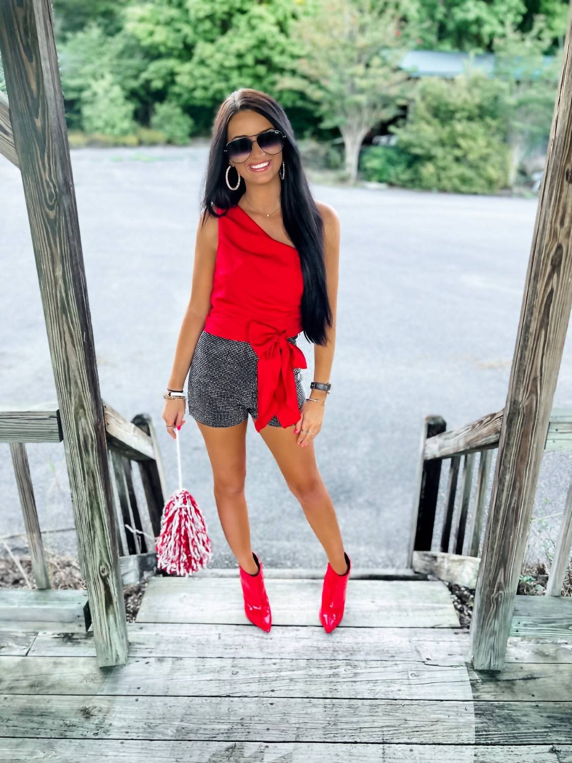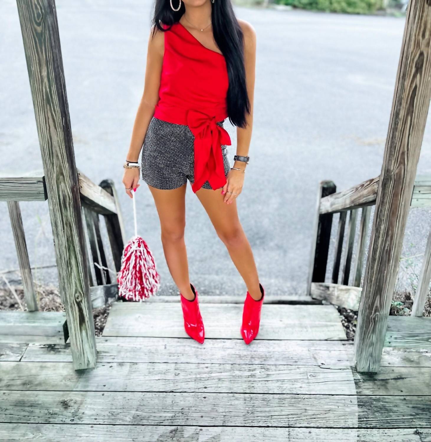 The perfect crop top for those warmer weather days. Discover the She's All That Top by GLAM, a striking red piece perfect for making a statement. This women's crop top is sleeveless with an off-the-shoulder neckline, featuring a pleated side and a dramatic bow in the front for a maximalist look. Crafted from 97% polyester and 3% spandex, with a 100% polyester lining, this solid pattern top is ideal for summer occasions like Valentine's Day or birthdays. Model is 5'6" and wearing a size small.