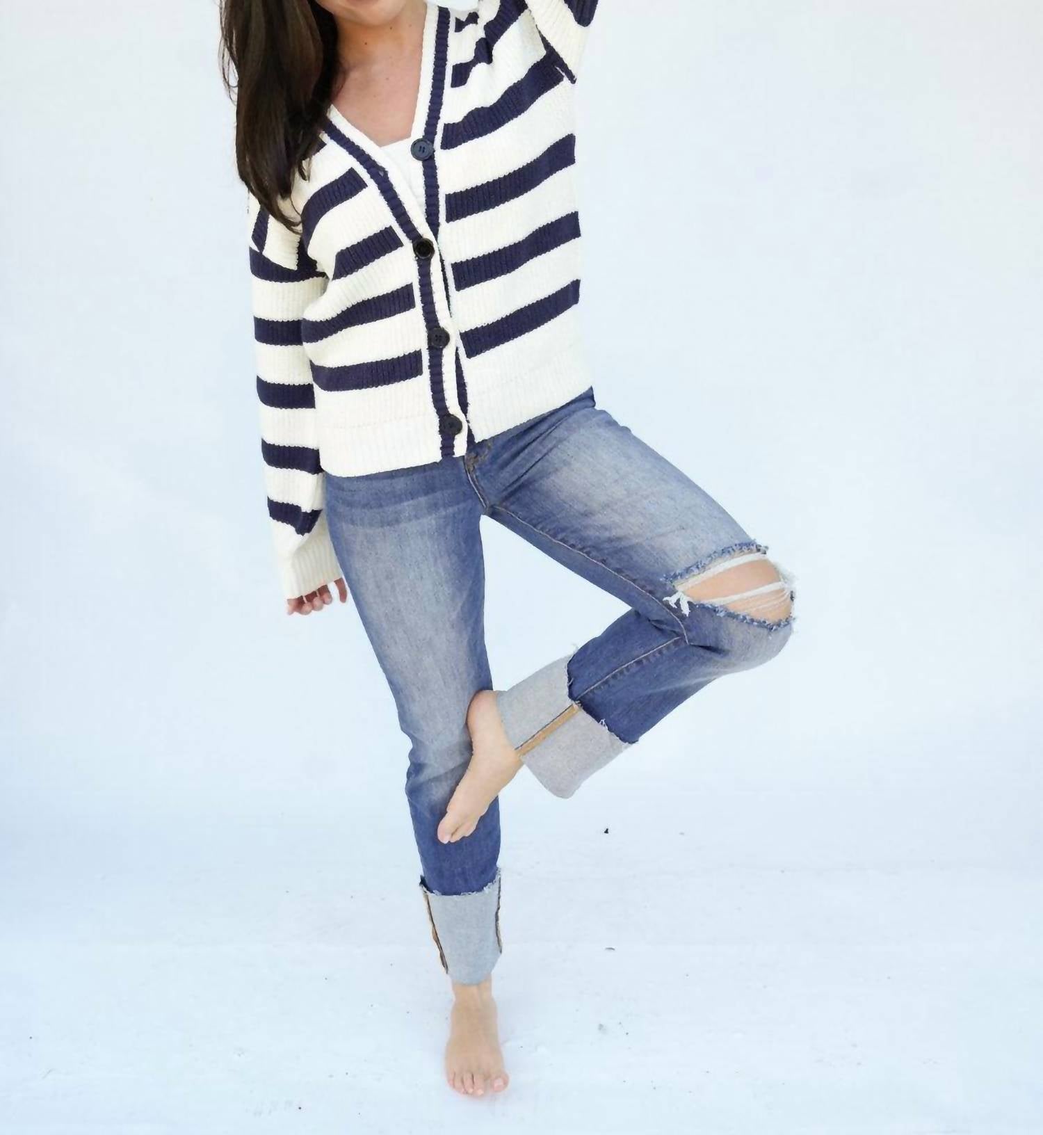 Meet your ultimate go-to for cozy style this season, the Kaylee Cardigan by Falcon Park. This cardigan showcases long sleeves and a comfortable oversize fit, crafted from a cotton blend with 60% cotton and 40% acrylic for plush warmth. Flaunting a chic stripe pattern, it features a deep V-neck and button closure, ensuring both ease and elegance. Measuring 24" in garment length, it provides ample coverage and style, making it an indispensable addition to your wardrobe.