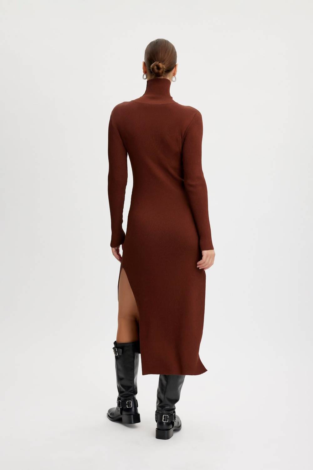 Dazzling and shimmering in sodium hue. With its long sleeves and slim turtleneck. Bodycon dress boasts a snug ribbed texture that hugs your silhouette gracefully. Made from 70% viscose and 30% polyester. Features a chic midi length with side slits for added flair. Originating from China. Designed with a convenient pull-on closure, offering both style and comfort.