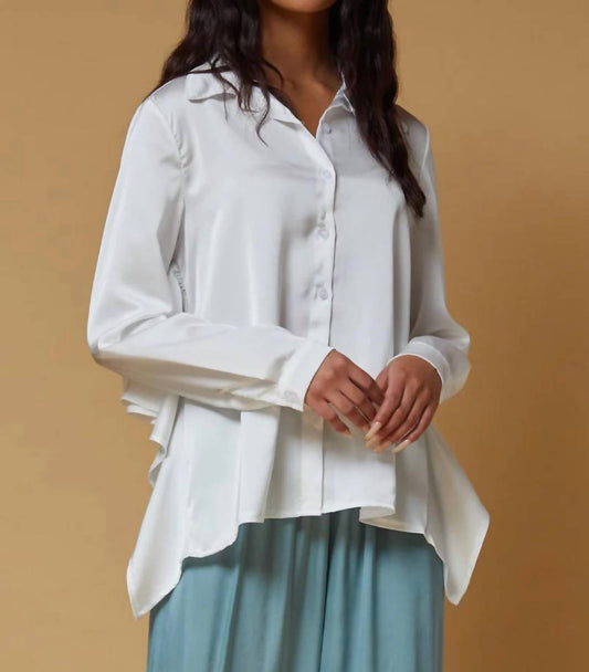 Silky smooth satin accentuates the elegance of a button-front blouse with a ruffled cropped back. This is the ultimate business in the front, party in the back top. Button-up closure. Full length sleeves. Ruffled back. Back tie detail.