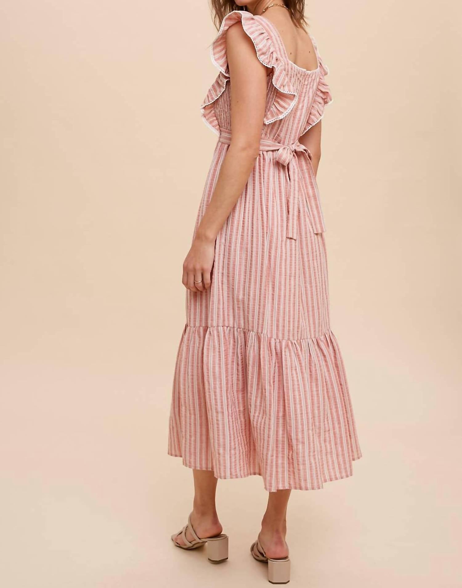 Just add slides or mules and you are good to go. The Striped Midi Dress by IN-LOOM is a captivating choice for your spring wardrobe. With fluttery cap sleeves and a chic stripe pattern, this rust-colored A-line dress is designed for effortless style. Crafted from a cotton blend, it features smocking detail and a back tie for added flair. Closure is pull-on with care instructions of hand washing and line drying, making it both practical and elegant for any vacation or Valentine's Day occasion.