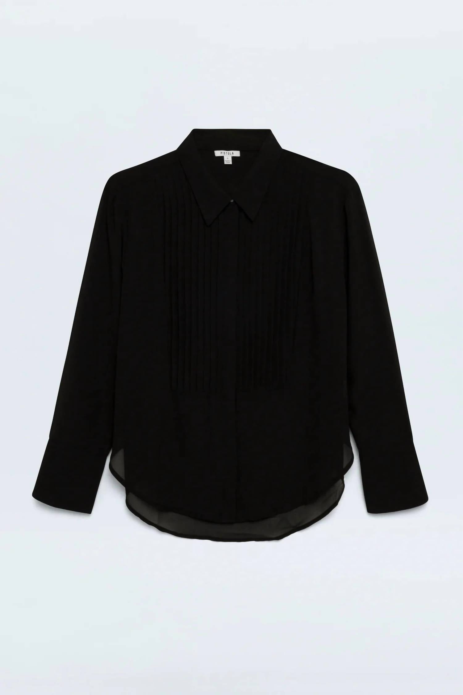 Perfectly tailored and soft to the touch. Elevate your wardrobe with the Charlotte Button Down Shirt by PISTOLA, a chic choice in a timeless noir hue. This shirt boasts long, cuffed sleeves and a collared neckline with a tuxedo-inspired pleated bib front, beautifully complemented by a high-low hem. Crafted from 100% polyester, it features a button closure for a classic touch. This imported piece measures 27.5 inches in length and should be hand washed to maintain its pristine condition. Model is 5’9” wearing size small.