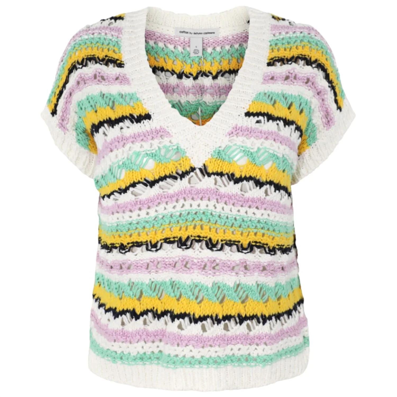You'll be reaching for this comfy and classic v-neck sweater all season long. Autumn Cashmere Open-Stitch Cropped V Cotton in Bright Combo Short Sleeve Sweater Open Stitch Knit Multi-Colored Stripes Low V-Neckline Ribbed Trim True to Size