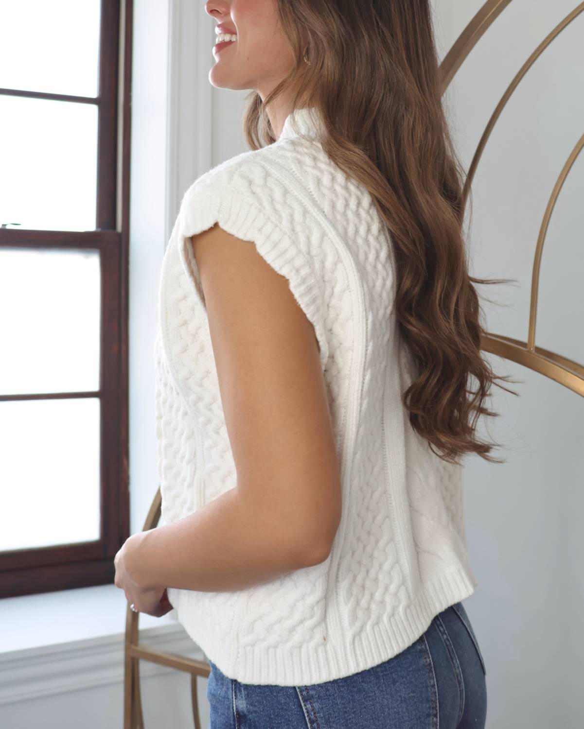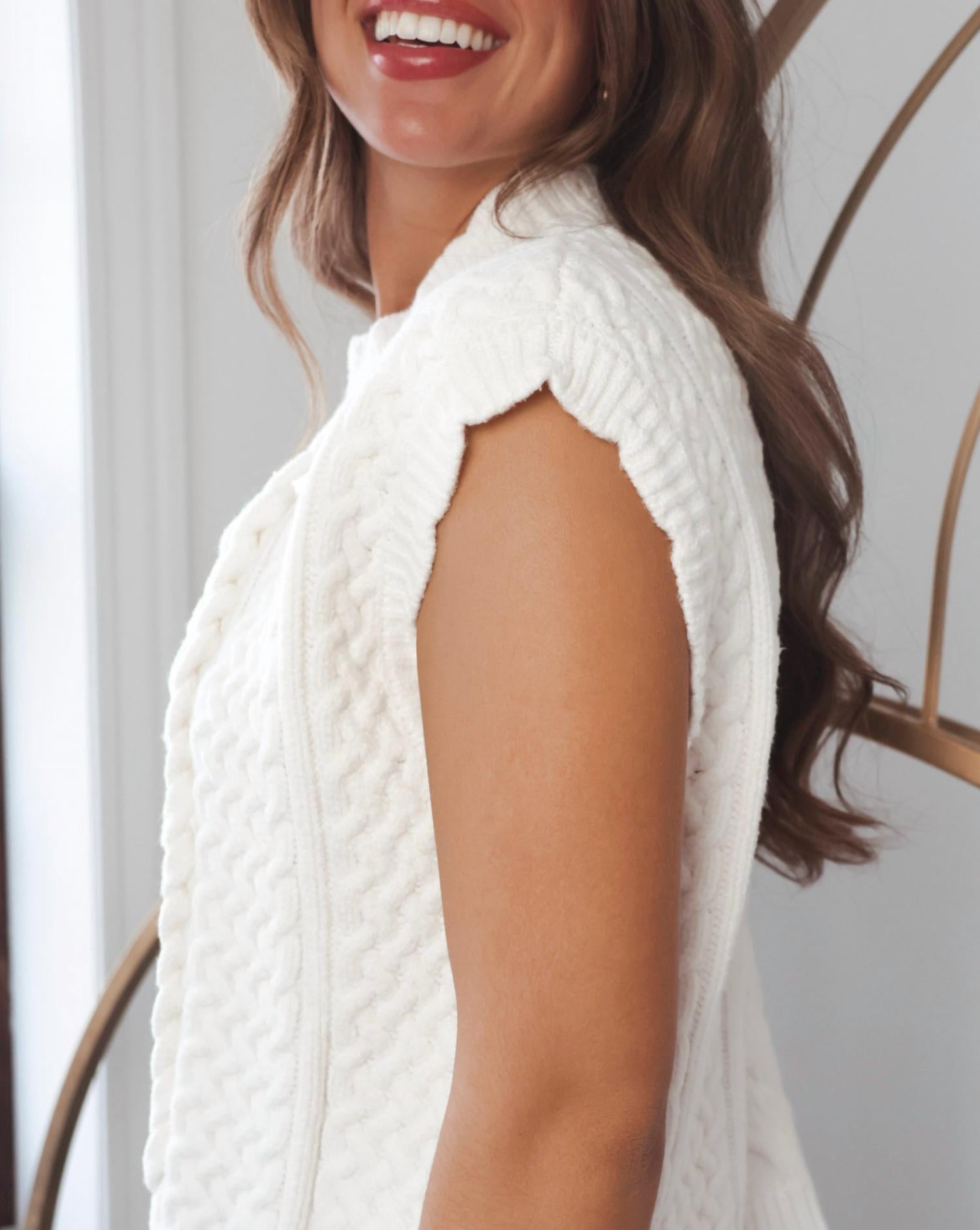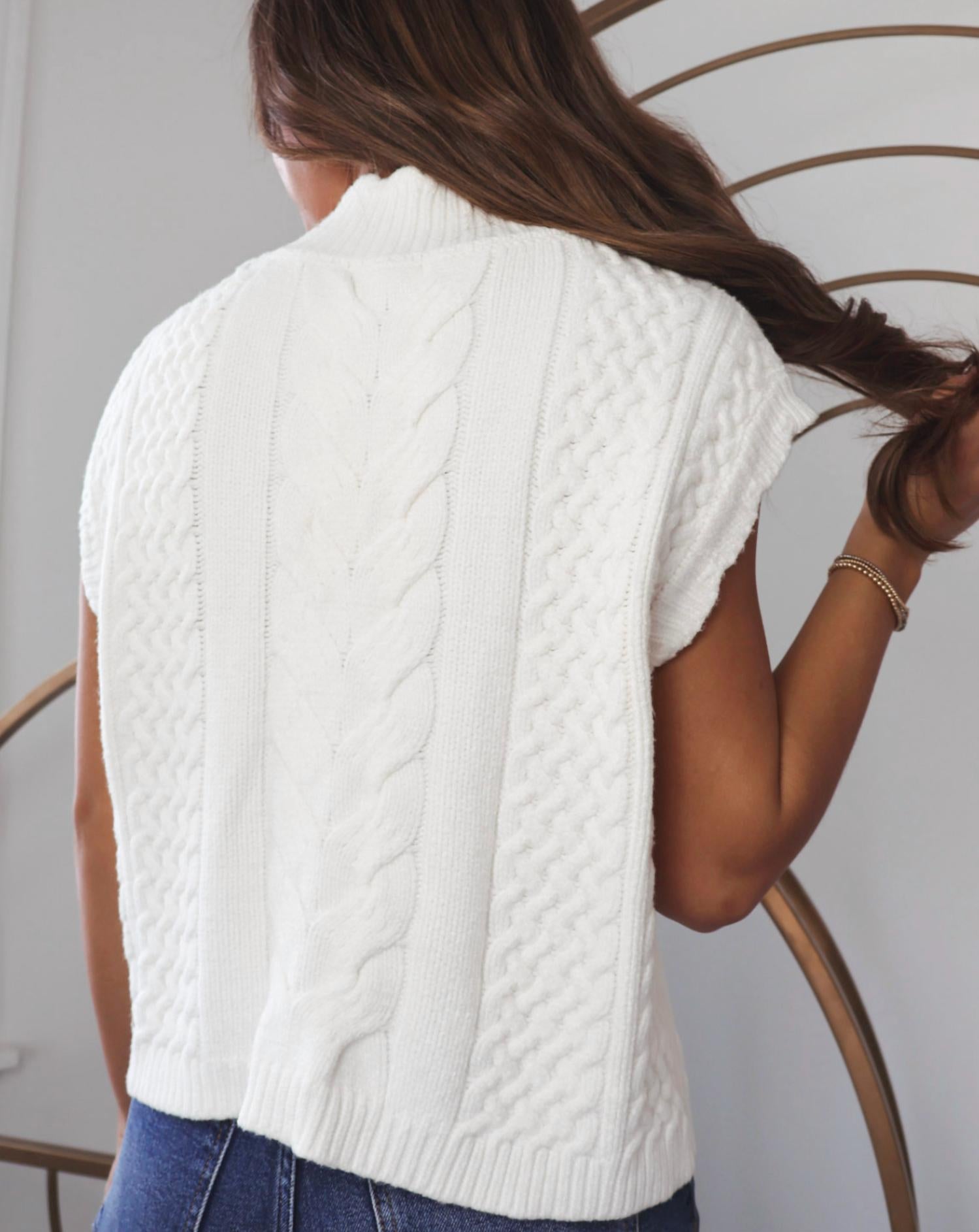That extra layering piece you didn't know you needed! Introducing the DELUC Elm Knitted Vest in a fashionable ecru color, perfect for chic layering. This sleeveless vest offers a cozy fit thanks to its 61% Viscose and 39% Polyamide cable knit composition. Designed with a crewneck and a pull-on closure, it runs true to size for an effortless style statement. Model Lauren, standing at 5'7", is wearing a size small, highlighting its versatile fit.