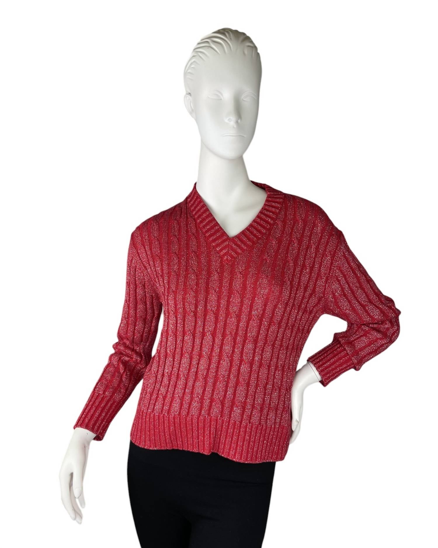 A timeless v-neck sweater that works season after season. Introducing the Hazel Lurex Cable V Neck Sweater by Alashan Cashmere, a striking piece in scarlet red designed for year-round elegance. Made from a soft blend of fine cotton and super fine Inner Mongolian cashmere in a 2ply yarn, this long sleeve sweater features a textured cable knit with shimmering silver threading for added allure. Its easy fit and V-neck design make it a perfect transitional piece for changing seasons. Closure is a convenient pull-on style.
