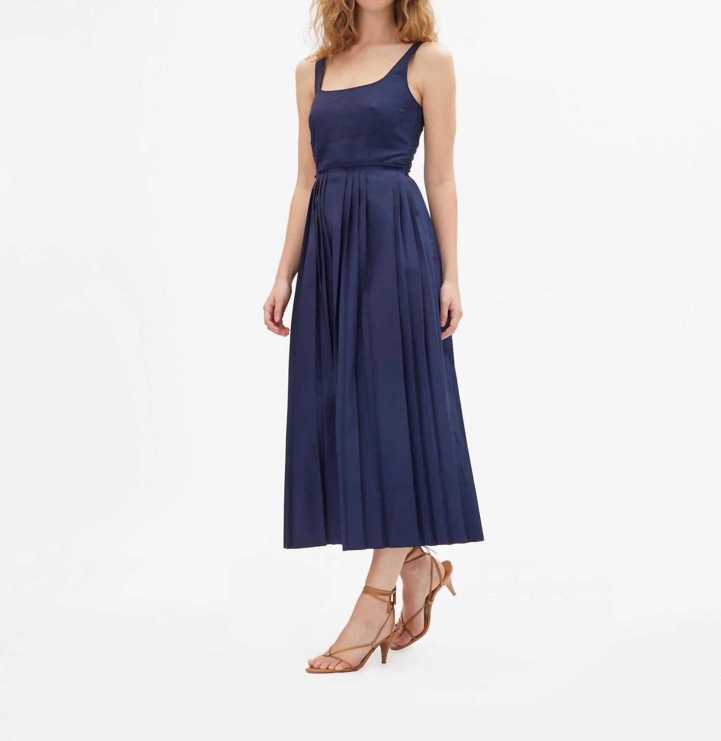 The perfect length dress does exist. Discover the Priscilla Dress by Tanya Taylor, a striking midi piece that effortlessly combines sophistication with everyday wear. This sleeveless dress, made from a blend of 80% polyester and 20% cotton with a lined bodice, showcases a flattering square neckline and a pleated skirt. Featuring a hidden side zipper and grosgrain waist detail, this maritime blue dress measures 51.5" in length from the high point shoulder. Crafted for a refined birthday occasion, it should be dry cleaned only for care. Sophie, at 5'9", models a size 2.