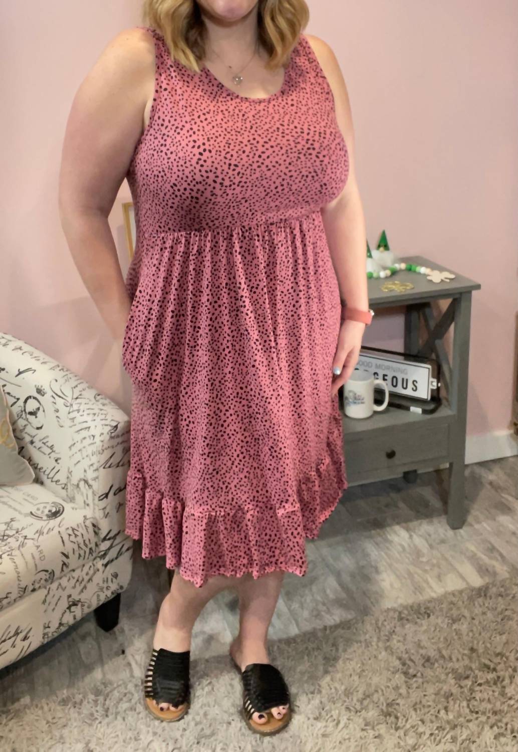 The perfect length dress does exist. Introducing the Bailey Ruffle Tank Dress by Michelle Mae, a charming blend of sweet and sassy for your wardrobe. This sleeveless dress, in a playful pink dot pattern and A-line silhouette, is crafted from a comfortable fabric composition of 96% Polyester and 4% Spandex, perfect for all-day wear. Designed with a scoop neckline and practical pockets, it features a pull-on closure for effortless dressing. Ideal for any adventure, this dress combines classy style with a touch of fun through its ruffle hem detailing.