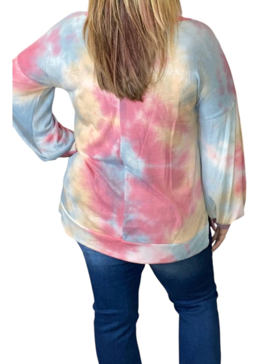Wide v-neckline. Tie dye. Long sleeves. Pullover style. True to Size. 68% Polyester 28% Rayon 4% Spandex.