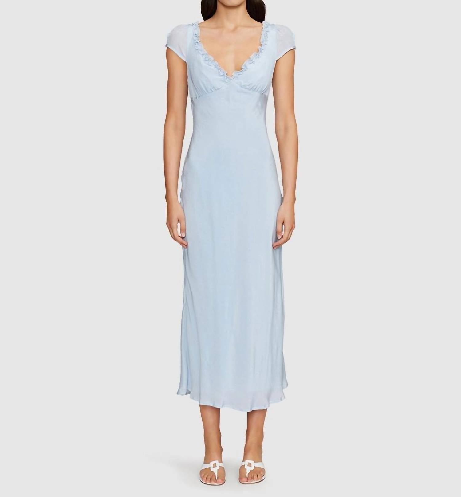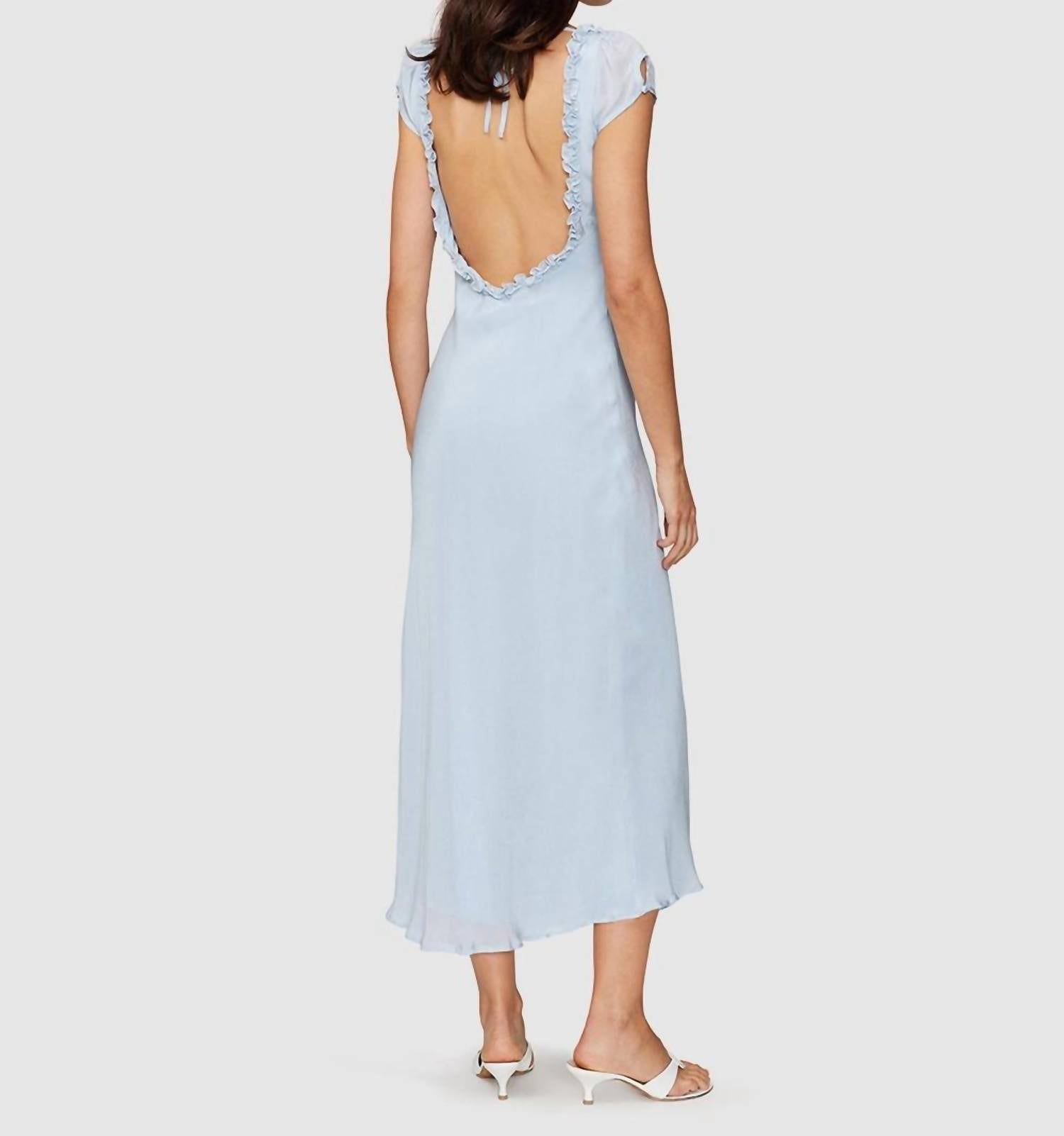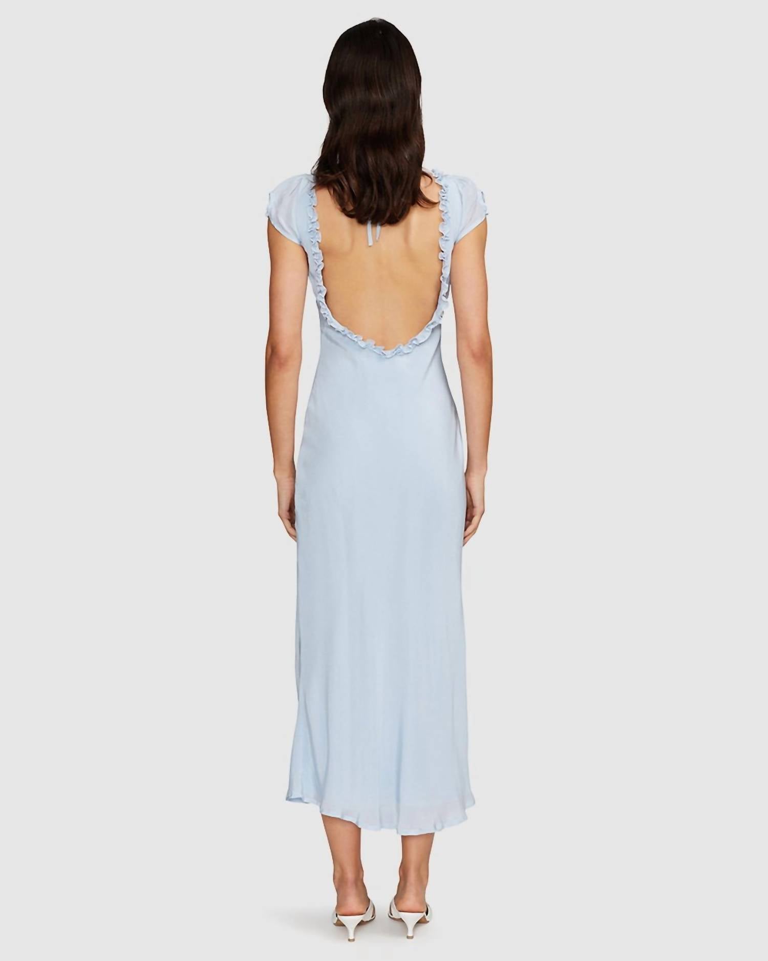 A midi dress so versatile, your options for wearing it are endless. Meet the Ownley Lottie Midi Dress in a serene sky color, a stunning piece designed for sophisticated style. This dress features cap sleeves with keyhole detail and stunning ruffle detailing around the neckline and low scooped back. Expertly crafted from 100% Rayon with a lining of 95% Polyester and 5% Elastane, this midi dress combines comfort with elegance. The bias-cut slip dress has a sleek, fully lined A-line silhouette with a tie closure at the back for a secure fit. To maintain its delicate fabric, gently hand wash it separately inside out, dry in shade, and avoid bleach and tumble drying. The model is wearing size small, with a length of 133cm and height of 175cm.