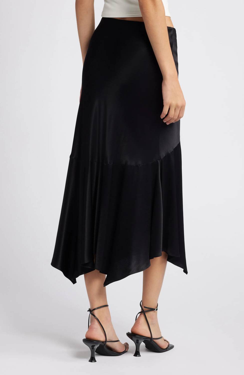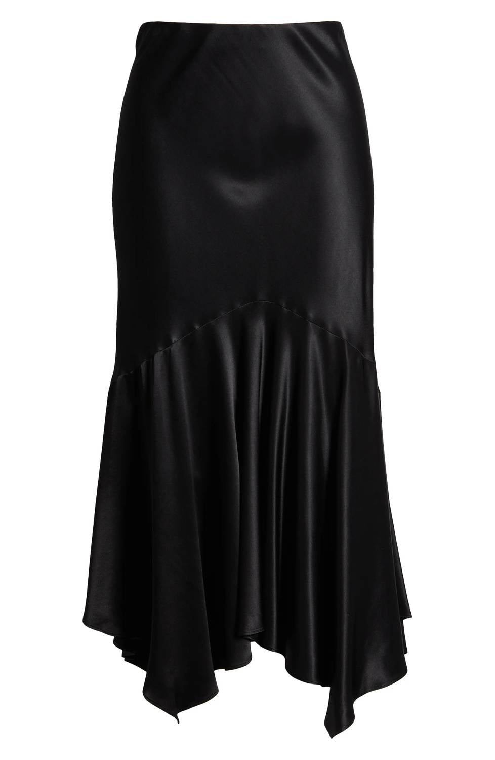 This asymmetrical skirt will take you from desk to dinner. Introducing the Edwina Satin Crepe Skirt by Rails, a sophisticated choice for your evening events. This black asymmetrical skirt features an ultra-smooth satin crepe composition of 55% Rayon and 45% Viscose, designed with a handkerchief hem for added style. With a convenient pull-on closure, this solid-patterned skirt offers a comfortable fit at a length of 29.5 inches. For care, please dry clean only for maintaining its premium feel.
