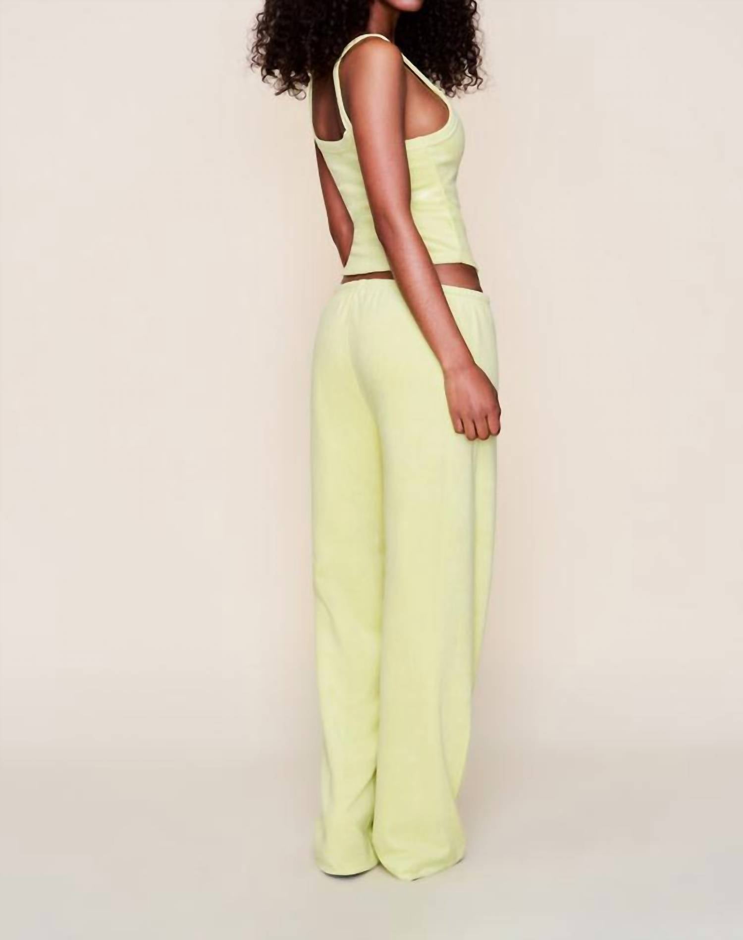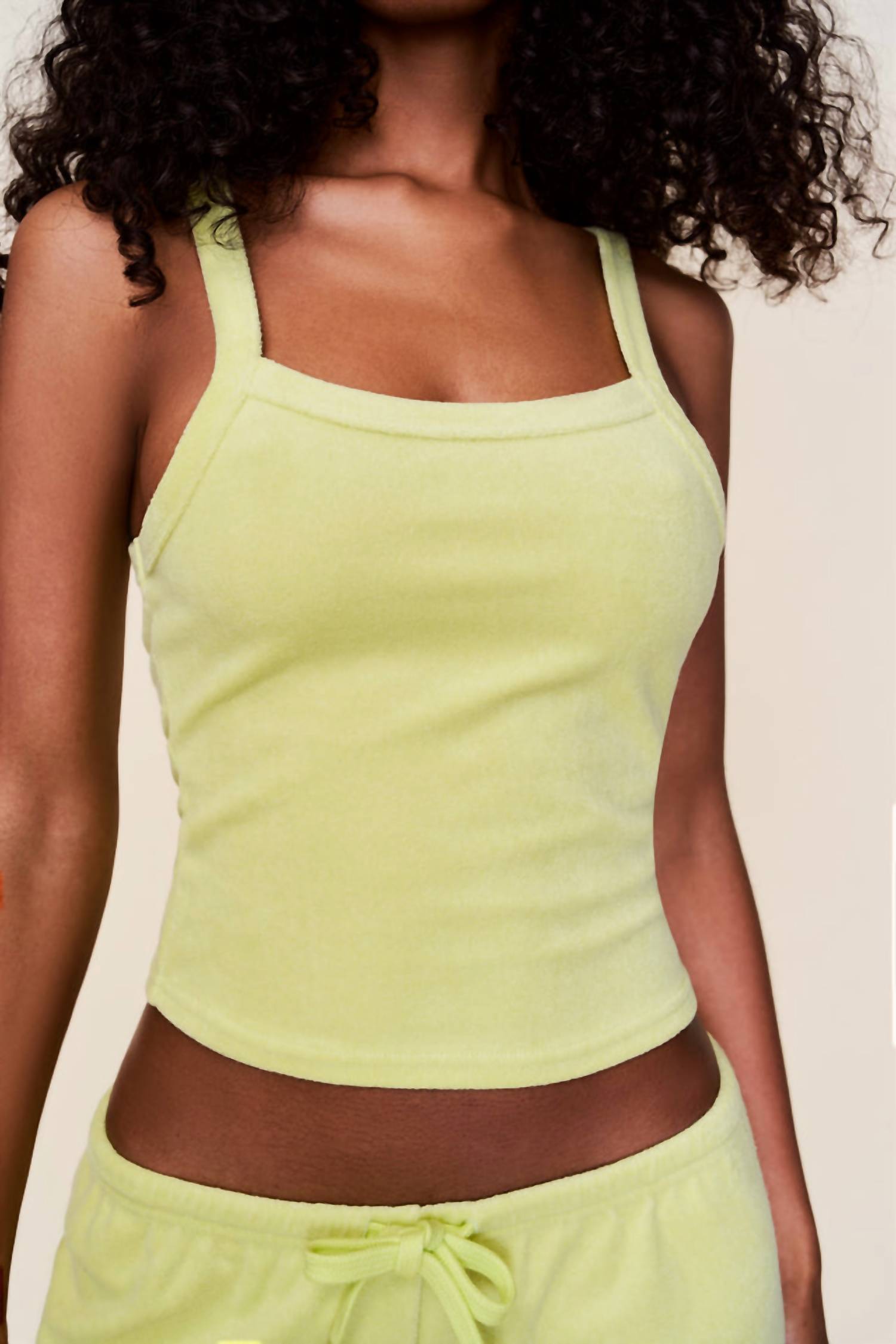 This classic tank top is perfect for layering and cute enough to wear on its own. Introducing the Guizio Dani Terry Tank, a chic summer essential in a refreshing Key Lime hue. This women's tank features spaghetti straps and a flattering squareneck, designed to highlight its minimalist appeal. Crafted from a plush terry cloth blend of 85% Cotton and 15% Polyester, it offers a soft, stretchy, and comfortably body-hugging fit. With a solid pattern and a convenient pull-on closure, this piece exudes understated elegance perfect for holiday parties. Model Eileen is wearing a size S (5'9" height, 32" bust, 25.5" waist, 35" hips).