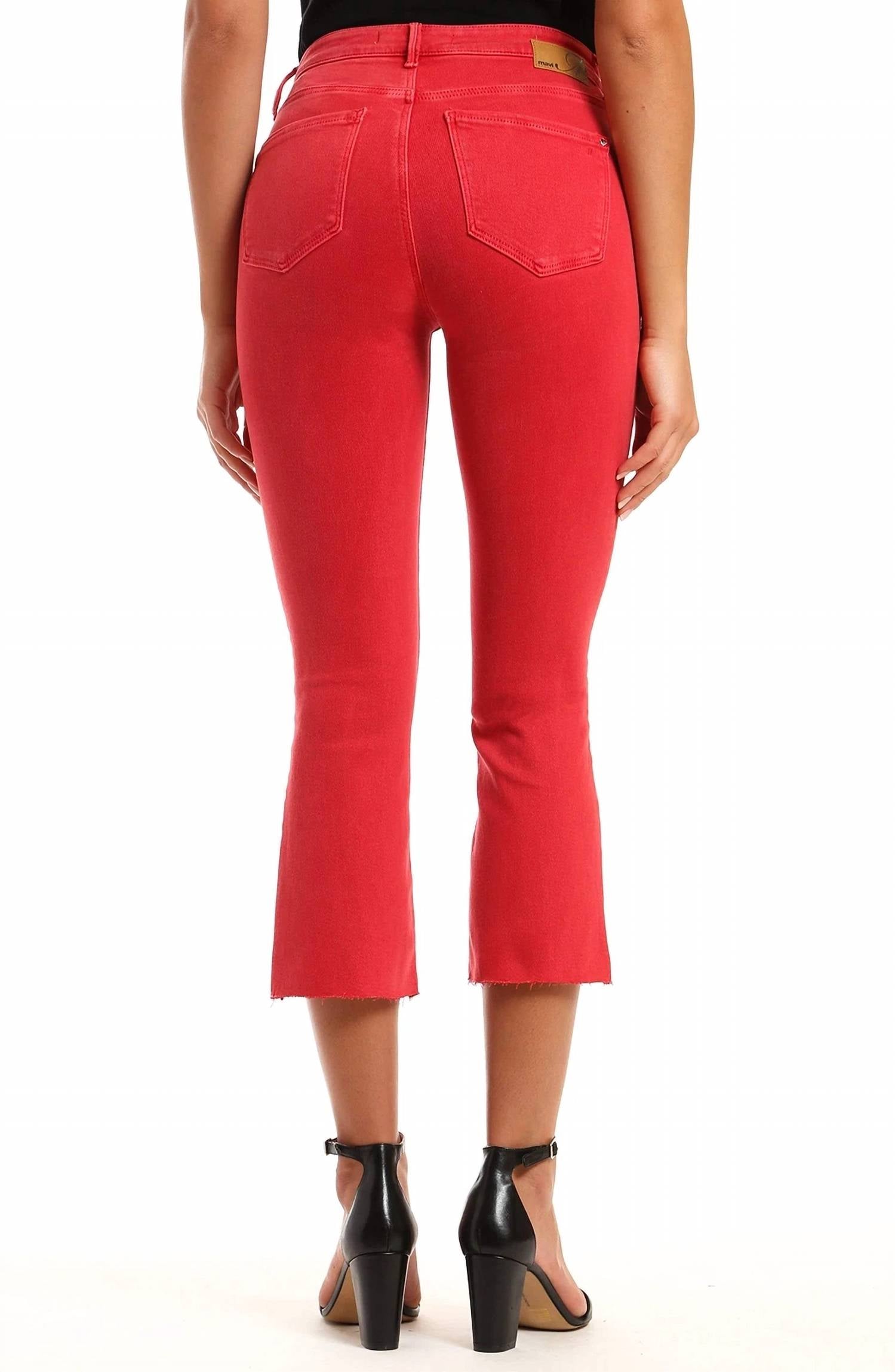 The perfect cropped jean for those transitional seasons. Introducing the Anika Crop Flare Jeans by Mavi, an essential addition to any wardrobe in an eye-catching brick hue. These women's jeans feature a high-rise waist with a flattering 9" front rise and 14 1/2" back rise, complemented by a stylish flared leg and raw hems. Expertly crafted from a cotton blend of 93% cotton, 5% polyester, and 2% elastane, these jeans offer a comfortable stretch with a slim fit. Closure: Zip fly with button closure. Care: Machine wash, lay flat to dry. Total inseam: 25 inches. Enjoy the convenience of a five-pocket design perfect for daily wear.