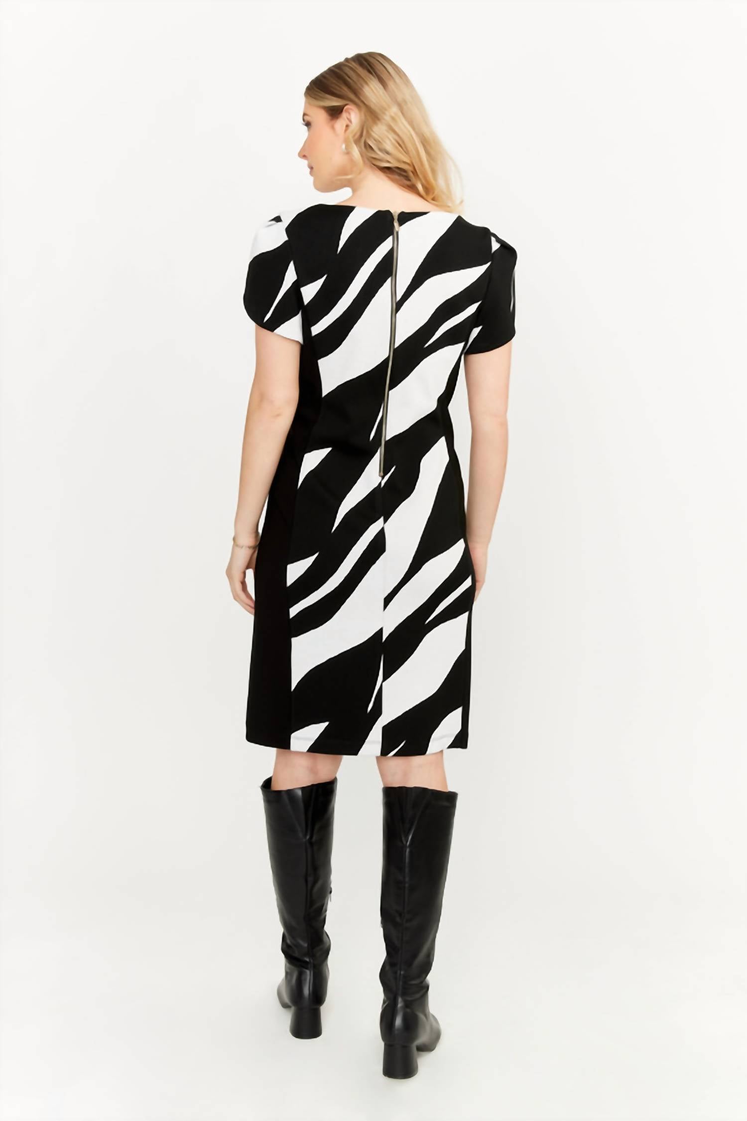 Featuring a stunning V-neckline with a slim-fit. Structured shoulders. Knee-length hem. Back zipper. Model is 5'9"wears a size 6. Approximate length (size 12): 40". Wash cold. 90% Nylon, 8% Polyester, 2% Elastane.