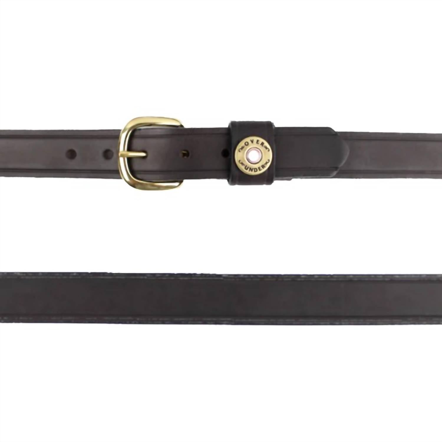 Introducing the Men's Single Shot Belt by Over Under, crafted from oiled and polished American bridle leather in a rich brown. This belt measures 1.5 inches in width and is available in lengths from 30" to 46", adorned with solid brass hardware and a distinctive shotgun shell detail on the keeper. Made in the USA, it offers a classic design that effortlessly transitions from outdoor adventures to professional settings. For optimal fit, it is recommended to order a size up from your usual waist size.
