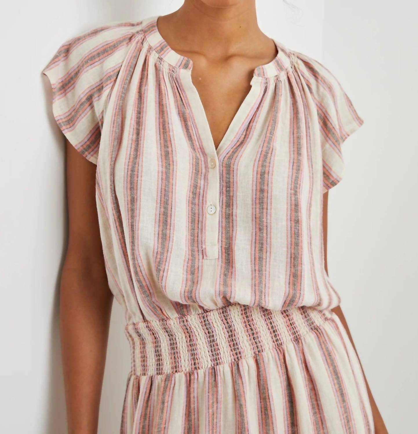 The kind of easy and flattering dress you'll be reaching for all season long. Discover the Augustine Mini Dress by Rails, designed in a charming Camino Stripe pattern. With its feminine cap sleeves and flattering V-neckline, this 36.125" dress combines a 55% Linen and 45% Rayon blend for comfort and style. Imported with functional button closures, it features a cinched waist and a flowy A-line silhouette, perfect for a breezy yet polished look. Care for this dress with a simple hand wash and line drying.