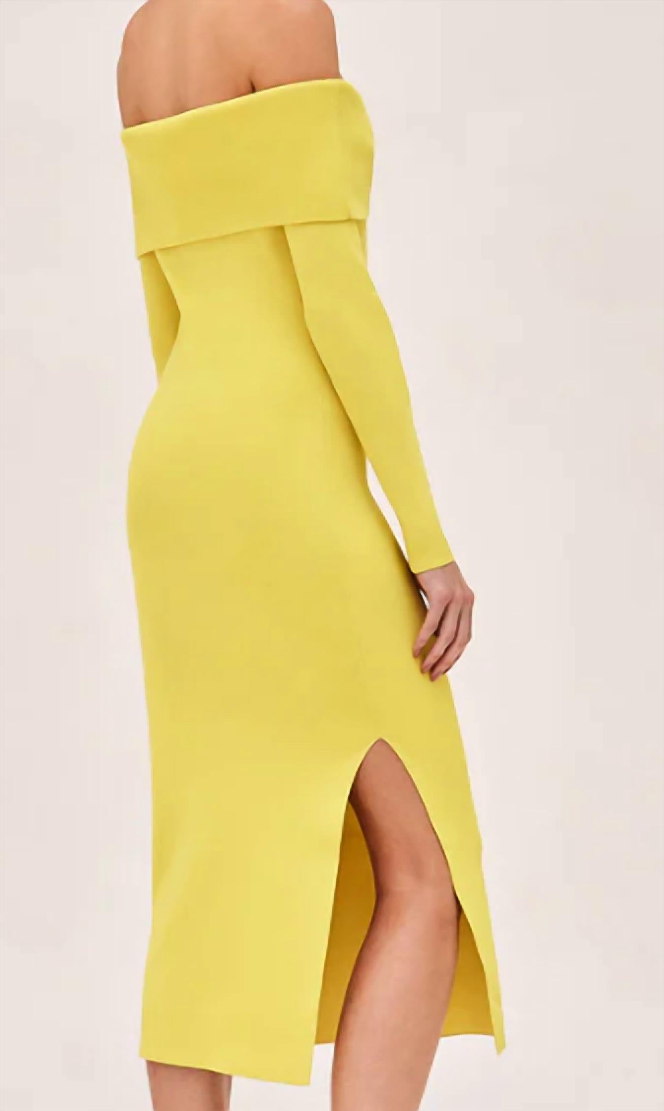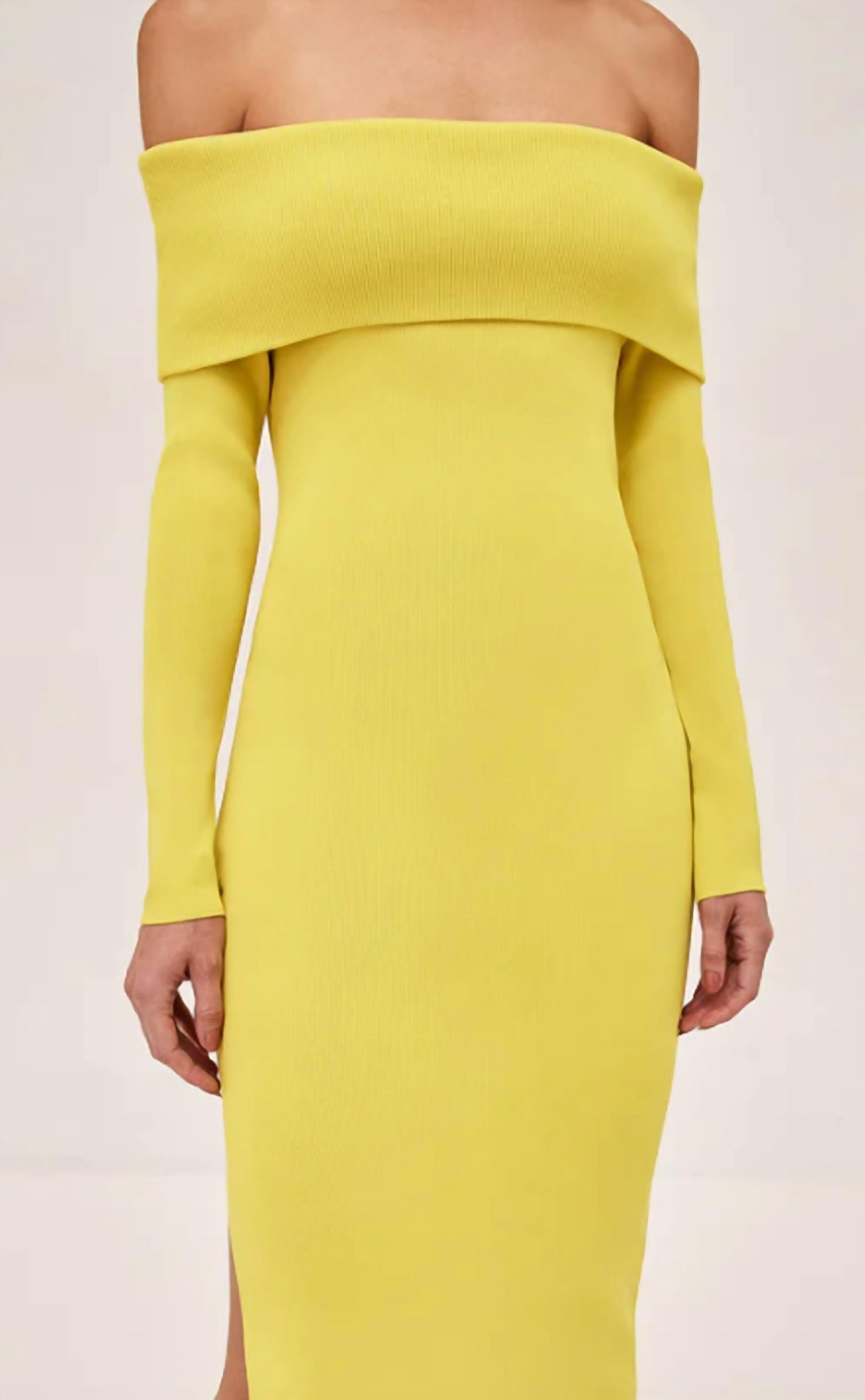 Ribbed knit midi dress in stretch The Justine Dress features a ribbed stretch fabric and fold-over detail. Also has side slit, and long sleeves. True to size. Comfortable and relaxed fit.