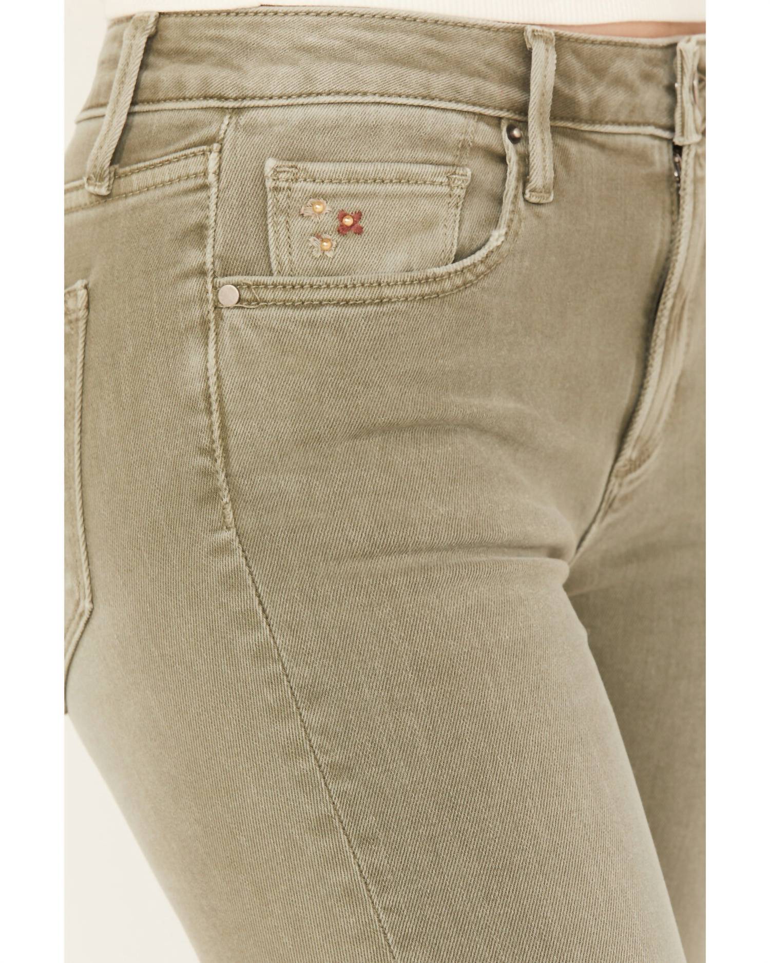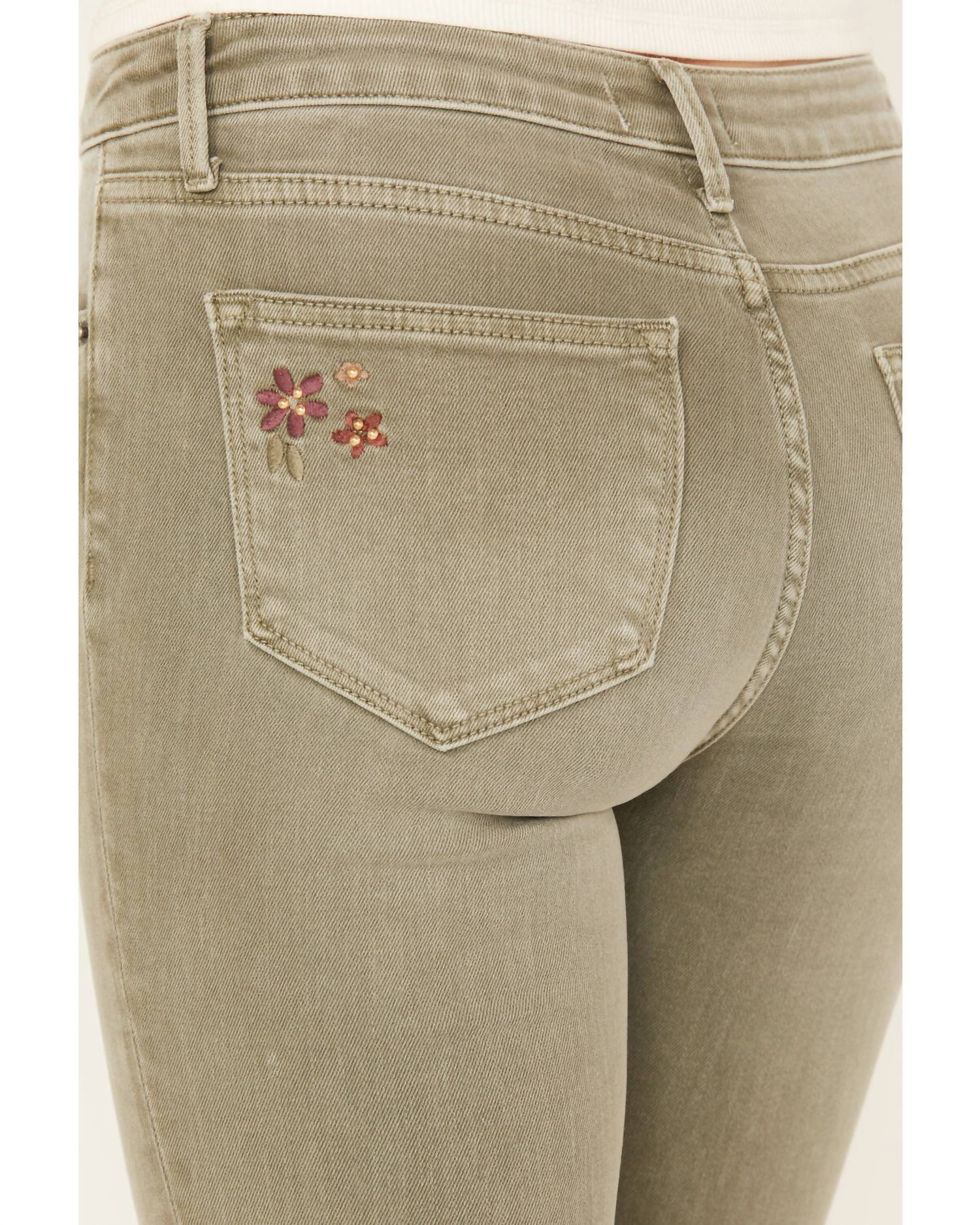 Pair these wide leg jeans with mules, slides or your favorite strappy sandals. Discover the Crop Flare Floral Rivit Jeans by DRIFTWOOD, designed for a stylish statement in olive with a captivating floral embroidery accent. Crafted from durable denim, these jeans feature a flared cropped leg and convenient five-pocket styling. They offer a secure fit with a zip-fly and button closure. Easy care instructions include machine wash cold and tumble dry low.