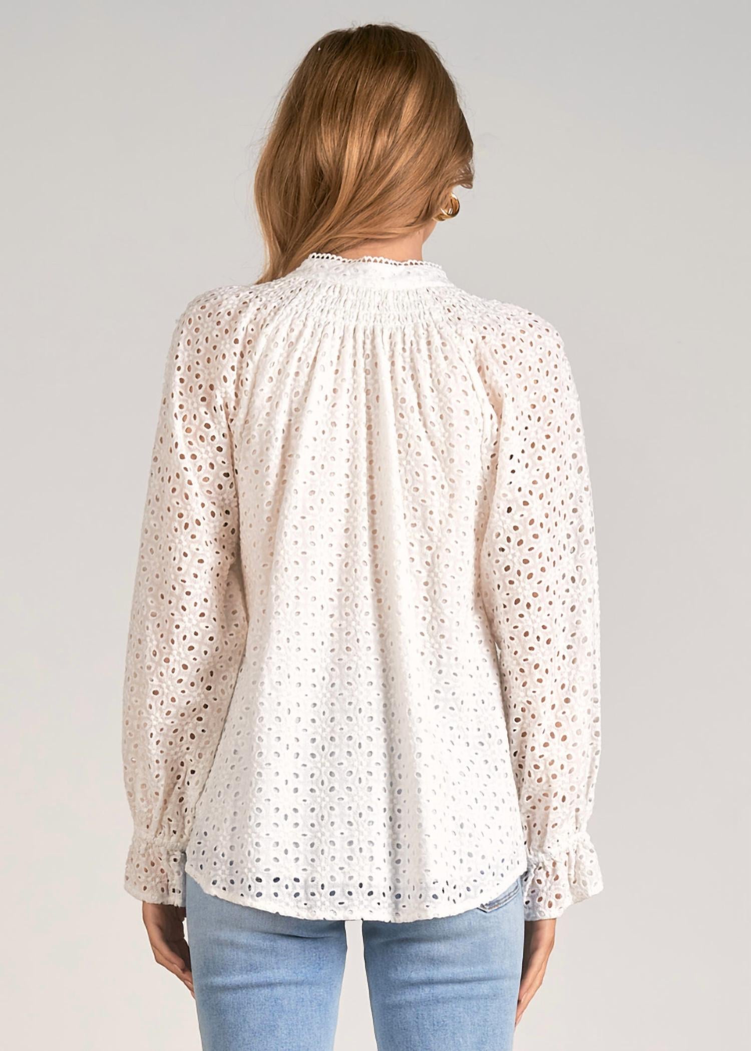 Pair this with your favorite jeans and slides for your next girls night out. Introducing the exquisite Long Sleeve Eyelet Top by ELAN, crafted from 100% cotton for both comfort and style. This beautiful white blouse features a textured eyelet embroidered floral design and elegant puff long sleeves with elastic cuffs for a tailored fit. The pleated gathered neckline with elastic stretch offers added flexibility, while the small white buttons fastened with elastic provide a unique, pull-on closure style. Ideal for any occasion, enhance your wardrobe with this versatile piece made for the modern woman.