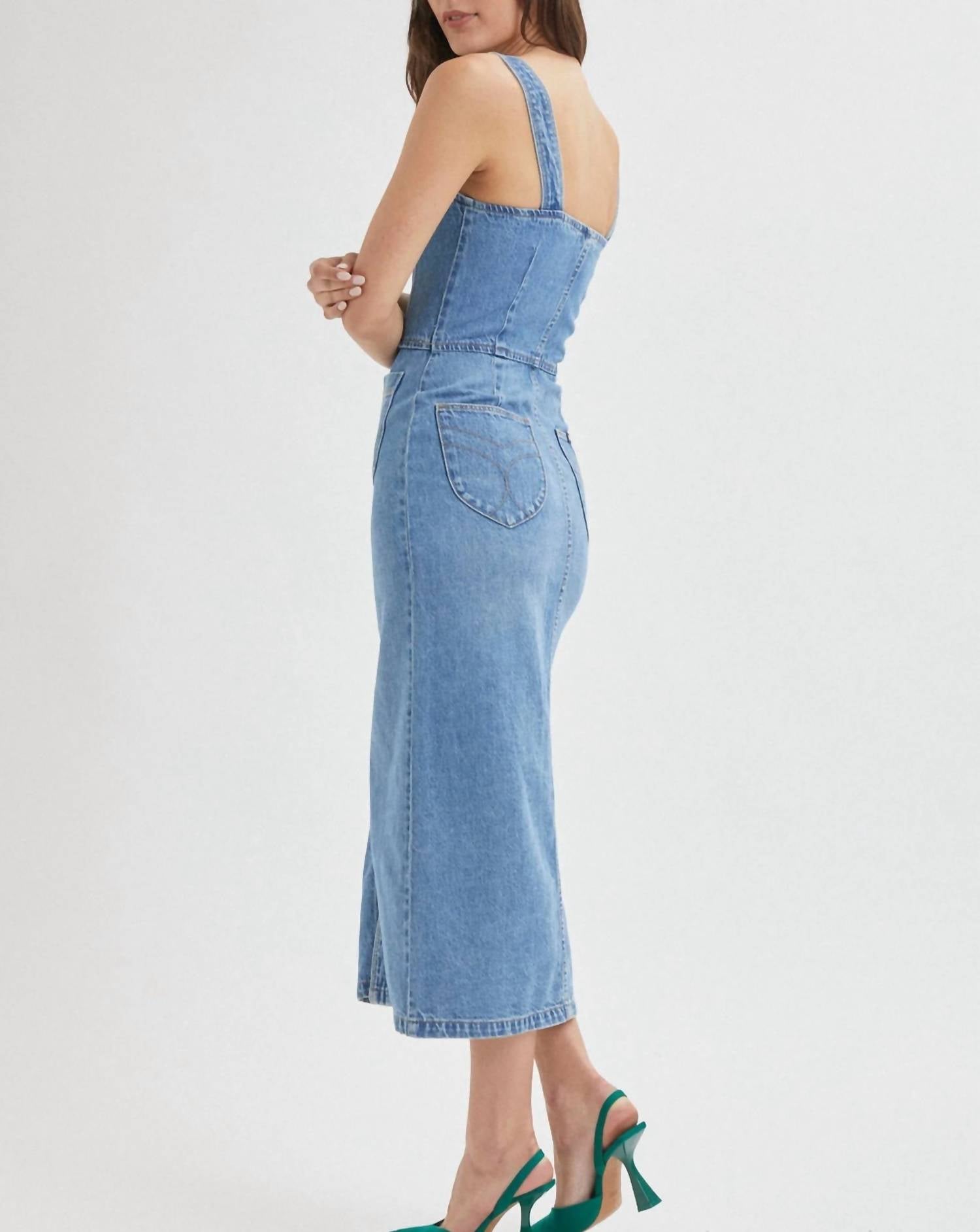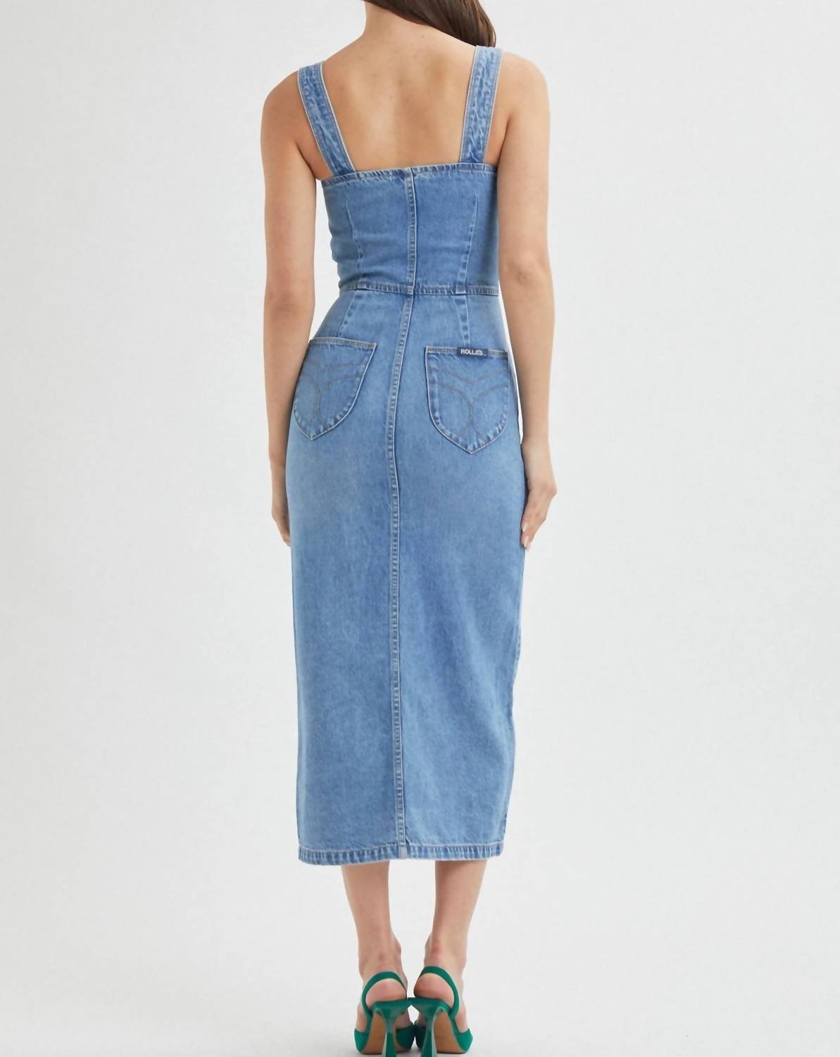 The perfect length dress does exist. Introducing the ROLLA'S Sailor Denim Midi Dress in striking azure, perfect for adding a splash of color to your spring wardrobe. This sleeveless dress is slim-fitting with a sheath silhouette, featuring a button-through front opening and distinctive sailor patch pockets on the front, complemented by the brand's signature back pockets. Crafted from a soft cotton blend with 79% Cotton and 21% TENCELâ„¢ Lyocell, it offers a comfortable, vintage-inspired look. The dress is machine washable and showcases vintage logo buttons for an effortlessly chic style, ideal for a dinner party or any special occasion.