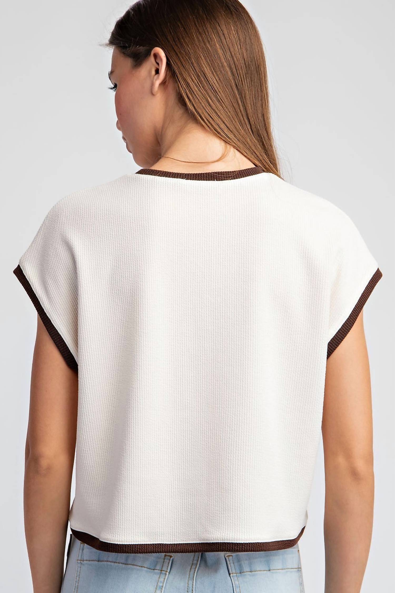 This classic, short sleeve tee will be your go-to staple this season and beyond. Elevate your wardrobe with the Two Tone Short Sleeve Top by ee:some, crafted in a chic cream color. Featuring cap sleeves and a crewneck, this solid-pattern tee is designed with an open front chest pocket for added flair. Made from a comfortable blend of polyester and spandex, it flaunts a slight cropped length with a finished bottom hem. Closure: Pull on.