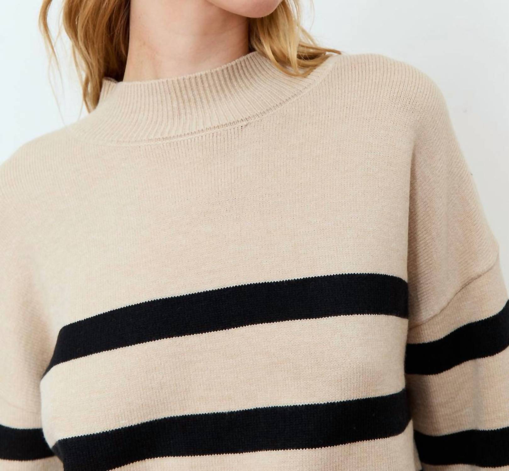 A classic fit that works just as good buttoned as it does left open. Introducing the Salvia Mockneck Sweater by DELUC, a stylish choice for fall engagements and casual occasions. With long sleeves and a mockneck design, this sweater combines the timeless appeal of beige melange and black stripes. Crafted from a cozy blend of 72% acrylic, 20% nylon, and 8% spandex, it offers a comfortable fit. Closure is pull-on.