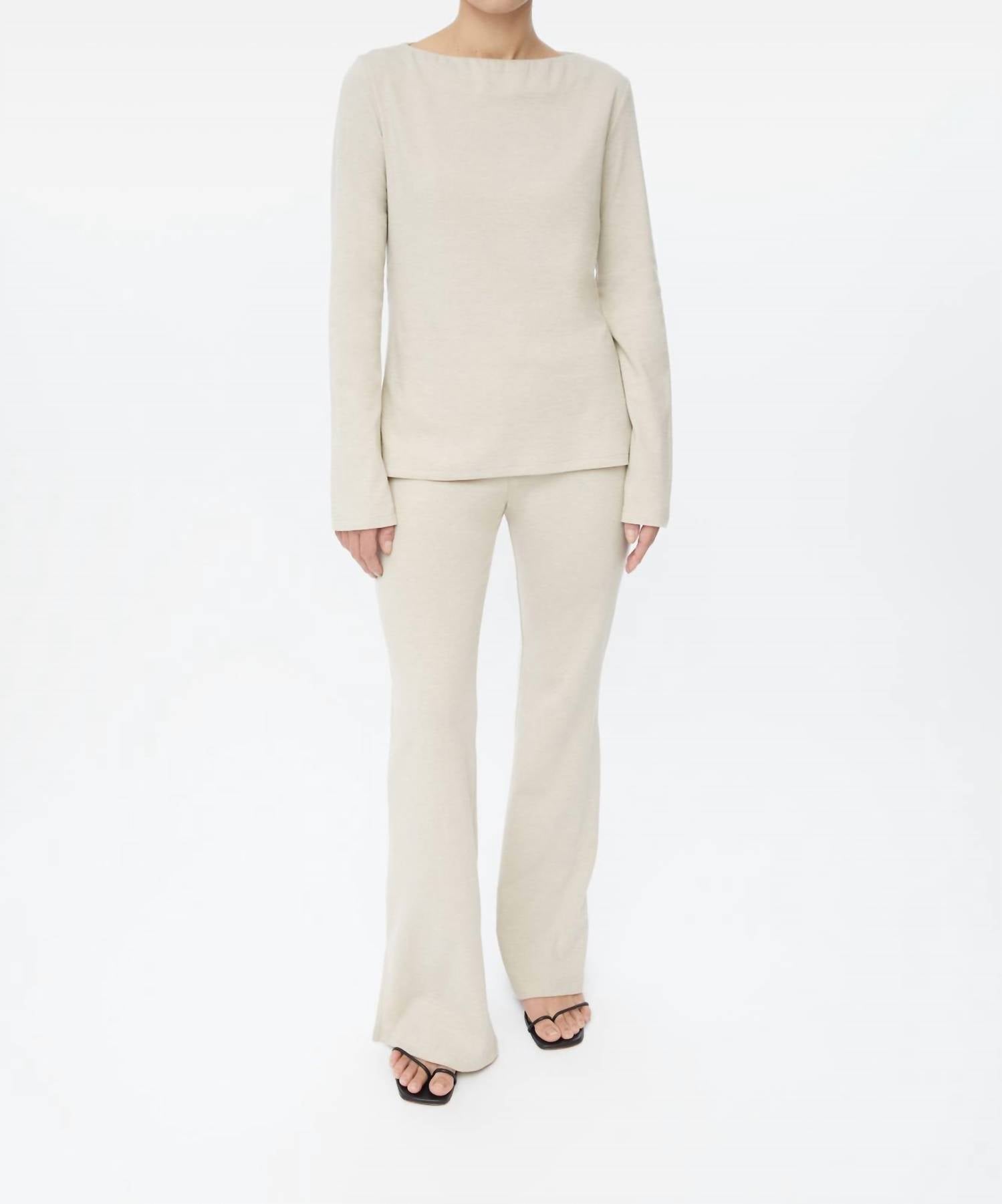 Stay warm and stylish in this versatile and effortlessly cool knitwear staple. Wear it alone or layered, it's the perfect sweater for the season and you'll wish you had it in every color. Experience the timeless elegance of the Wool Blend Boatneck Sweater by Dāl the Label in a sophisticated oat hue. This chic piece features long split sleeves, designed with a contemporary flair, and a flattering A-line silhouette. Crafted from a luxurious wool-cotton blend, the sweater offers a cozy, soft feel that complements its minimalist, solid design. The pull-on sweater is perfect for spring getaways and festive gatherings, with care instructions recommending dry clean only.