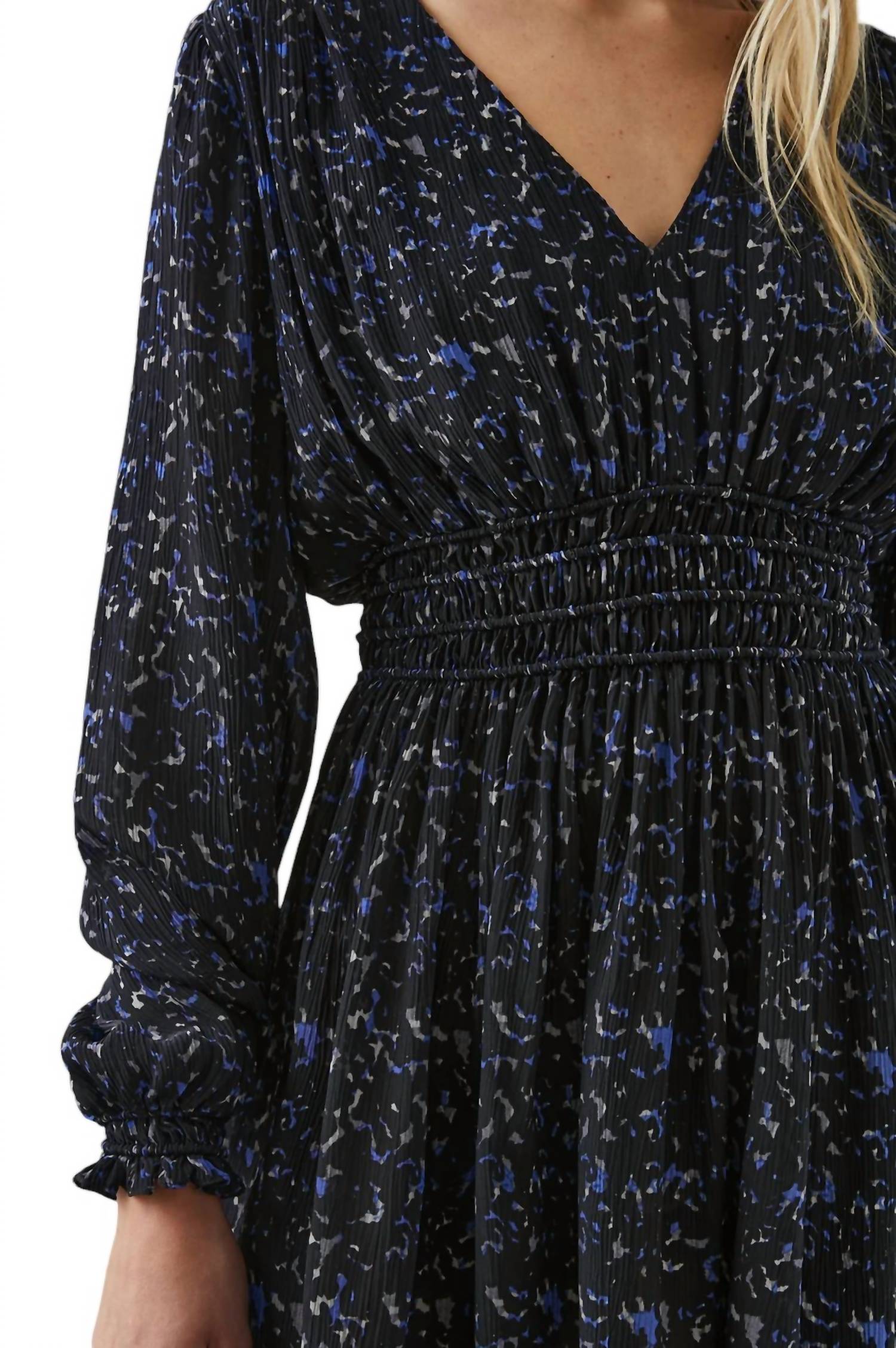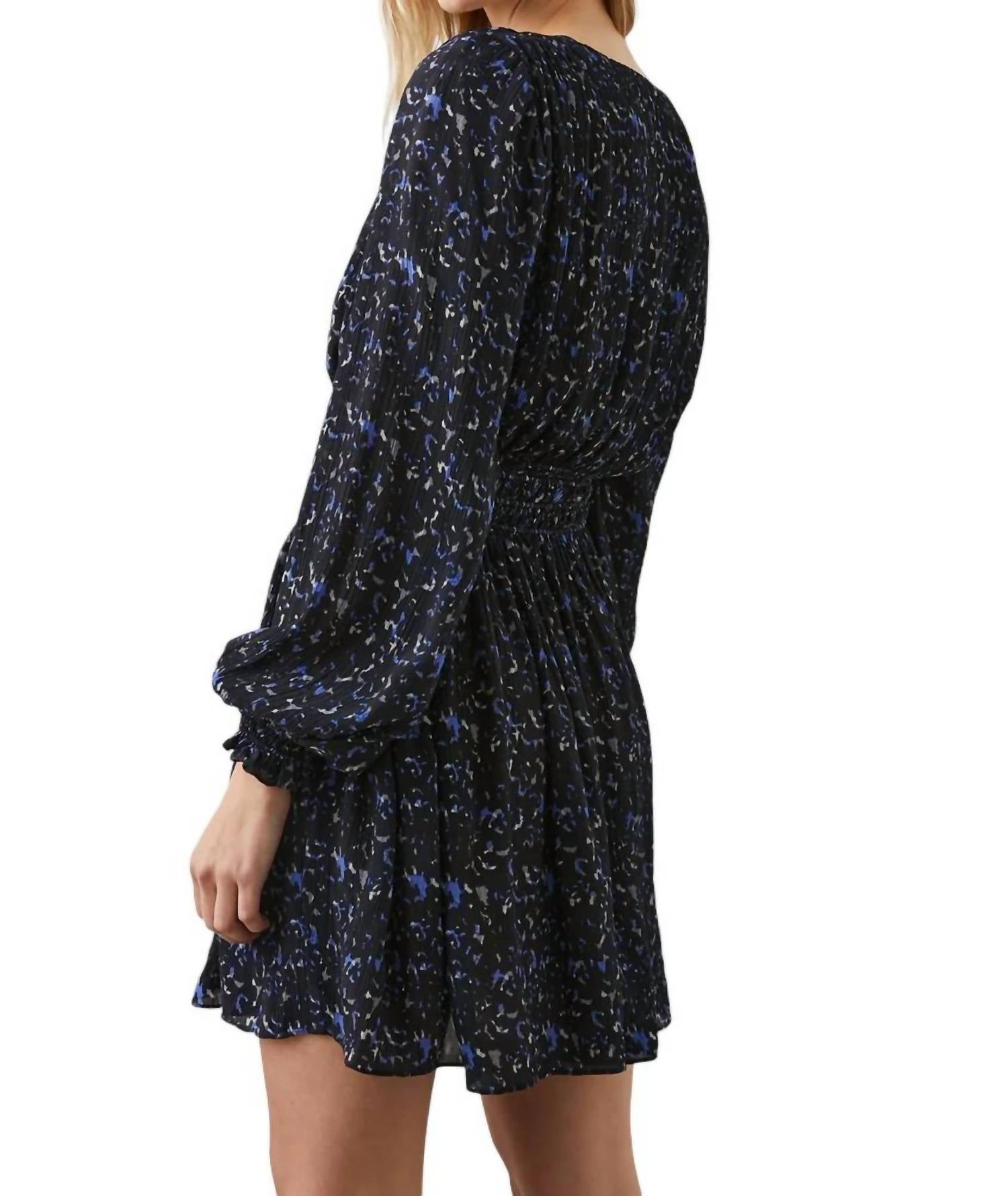 This mini dress features long sleeves and a deep V-neckline with a cinched waist. Made from 100% viscose chiffon plissé, it offers a flattering silhouette. Dry clean only. True to size. Front body length is approximately 36 inches (measured from size Small).