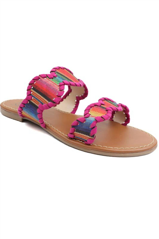 Two band handmade slide sandals with whipstitch detail. Medium width. Open toe. Flat sandals. Made in Colombia.