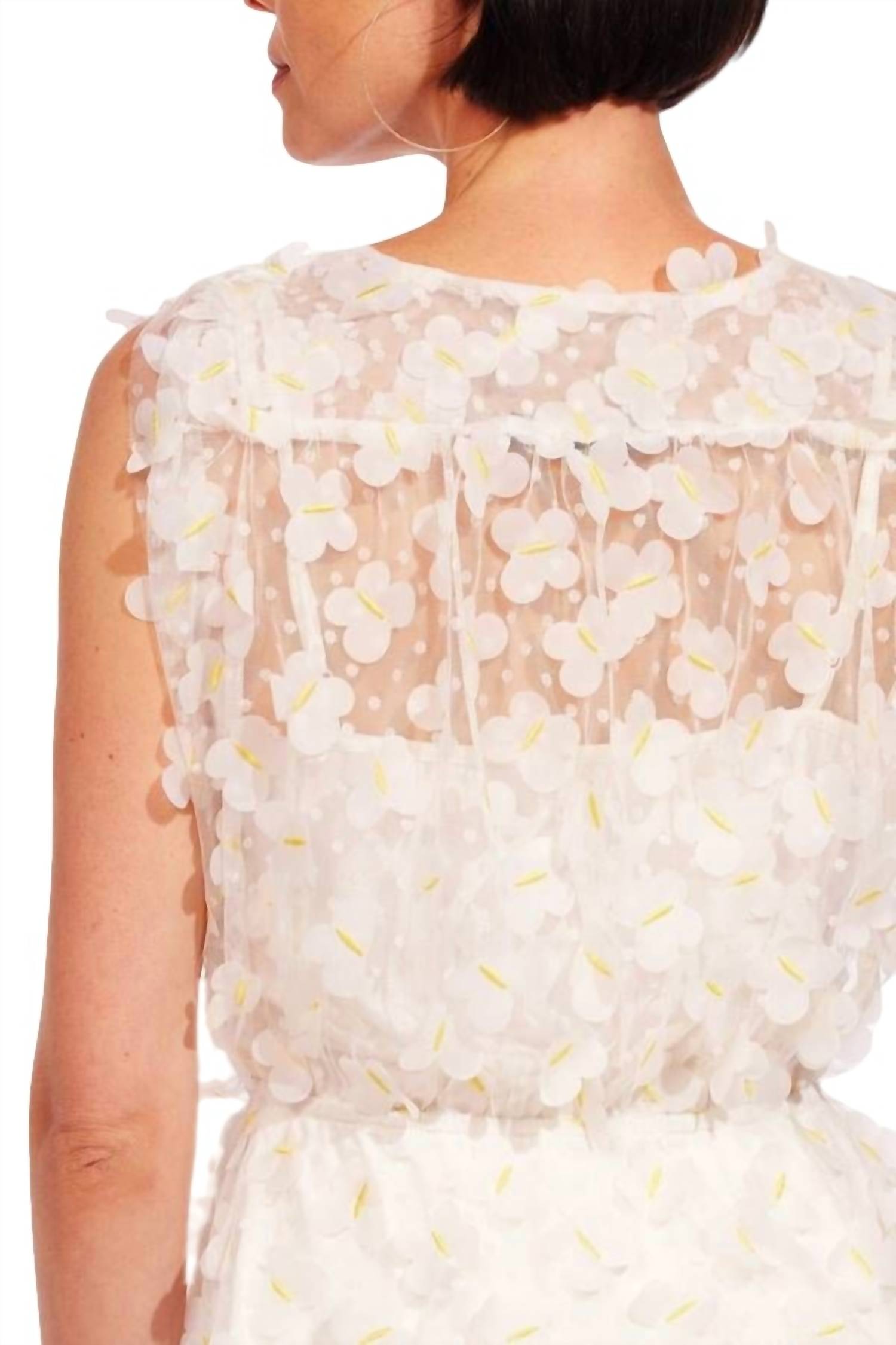 Sleeveless top and lined with white jersey and has integrated elastic waistband. 3D white petals on mesh fabric. Integrated elastic waistband. Fully lined with white jersey tank. 100% Polyester. Lining: 100% Polyester