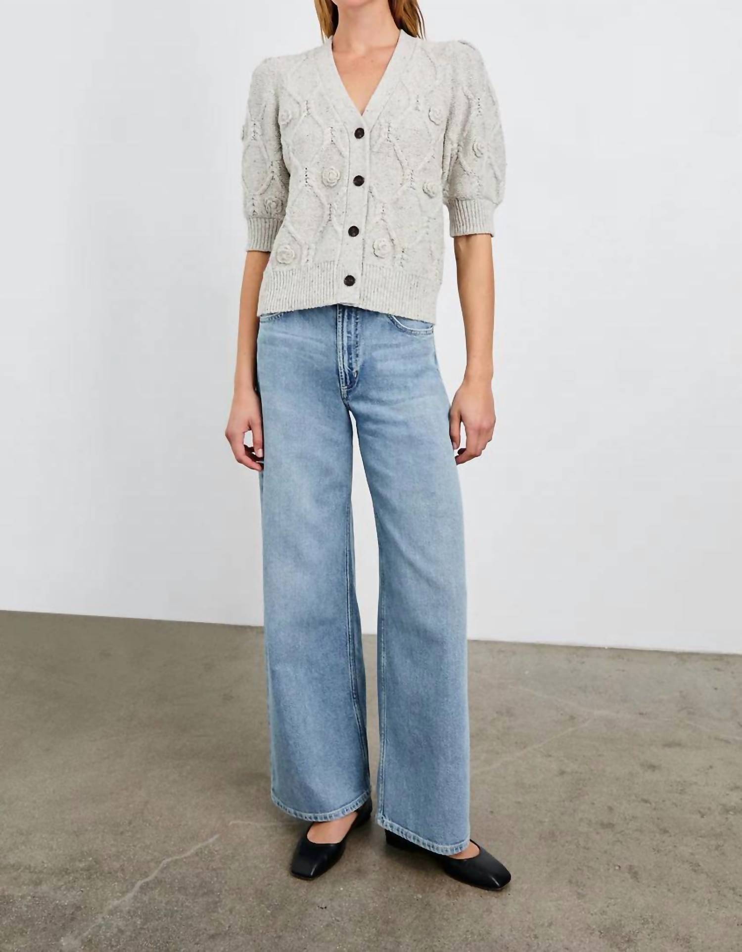 This cardigan will be a sweater-rotation favorite. Introducing the Isla Cardigan by Rails, a sophisticated short sleeve piece in grey, charmingly adorned with crochet daisies. This cardigan features an argyle texture with elegant braided buttons, crafted from a warm cotton-wool blend. Composition: 60% Cotton, 30% Nylon, 10% Wool. Closure: Button closure.