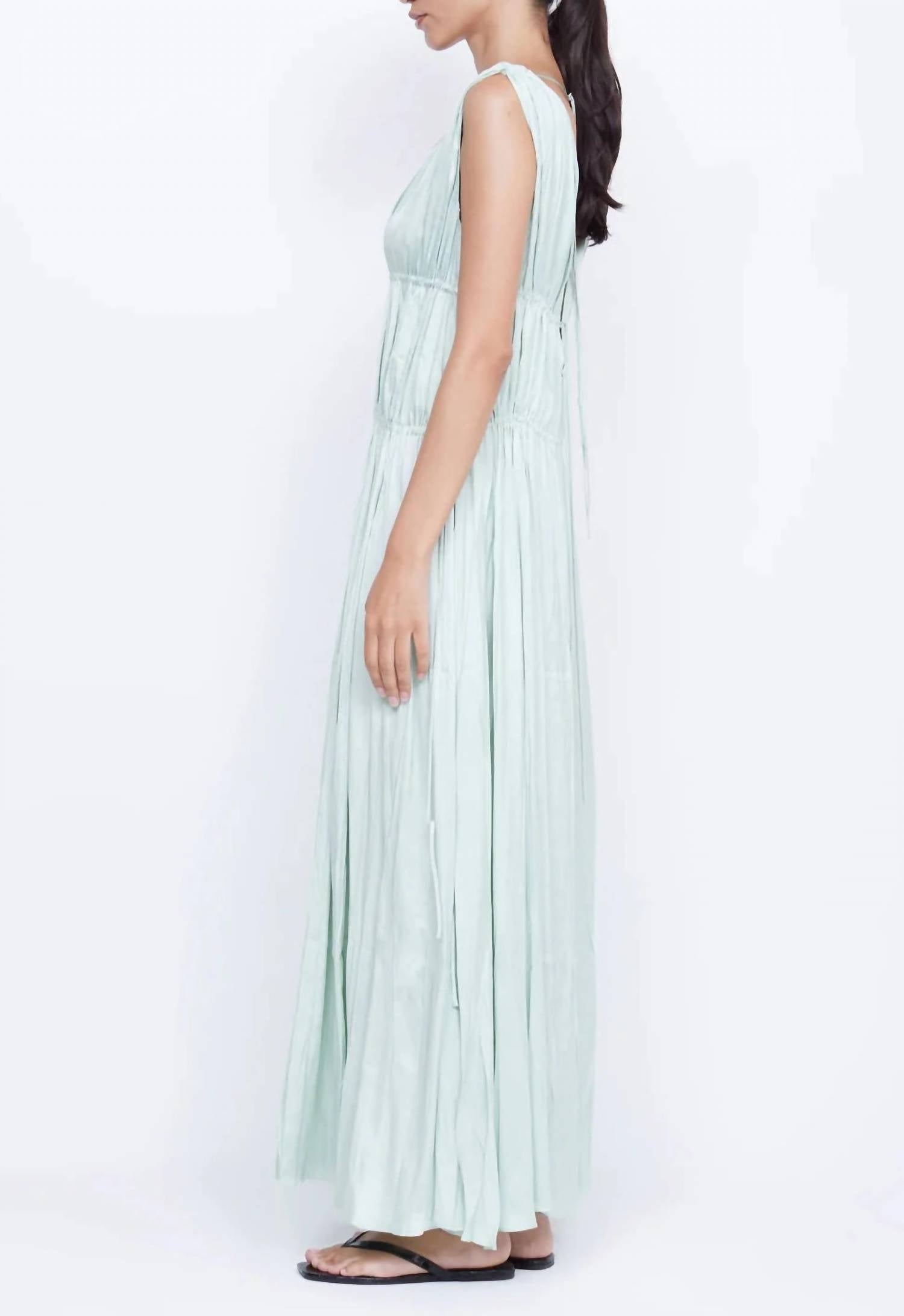Stunning mint hue. Crafted from a lustrous, lightweight fabric. Epitomizes effortless style. Relaxed silhouette is adorned with a deep V-neckline. Complemented by mid-thigh side splits. Features gathered channels at the underbust and low waist. Culminating in self-tie adjustments at the open back for a customizable fit. Pleated skirt cascades beautifully into a maxi length. Exuding a fluid and graceful charm. Offering ease through pull-on styling. Relaxed yet sophisticated fit. Luxurious polyester, provides a delicate sheen but lacks stretch. Treat this specialty garment with care, opting for professional dry cleaning to maintain its pristine condition.