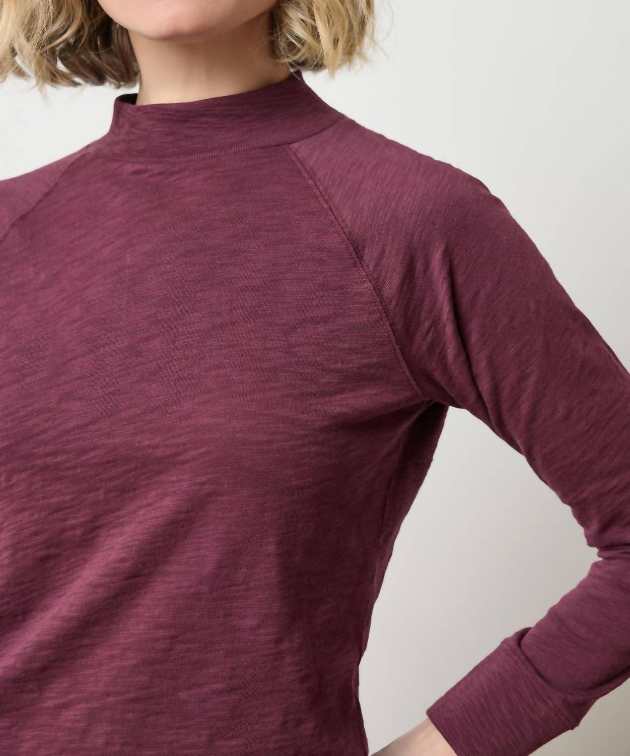 Great fit, cute design, soft fabric. You'll love everything about this long sleeve tee. Introducing the Raglan Mock Neck Top by Lilla P, a sophisticated piece in rich merlot. This top features three-quarter sleeves and is crafted from 100% cotton slub yarn, offering a soft feel and perfect weight. With a garment length of 22.5 inches, it has a pull-on closure and is an excellent layering piece for any minimalist wardrobe. Care instructions include machine wash and line dry.