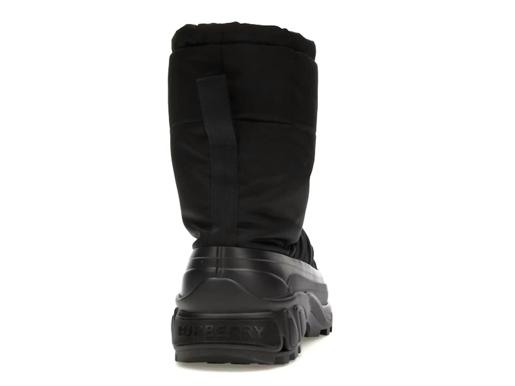 Step out in style with the Men's Arthur Puffy Boots by Burberry, featuring a solid black color and crafted from durable leather and textile fibers. These padded ankle boots boast a lace-up closure, brand logo, and ensure comfort with internal padding. Designed with a round toe and a distinctive lug sole with a square heel, they bring a touch of class to any outfit. Perfect for small-sized feet, these boots redefine rugged elegance with their high-quality shell and remarkable craftsmanship.