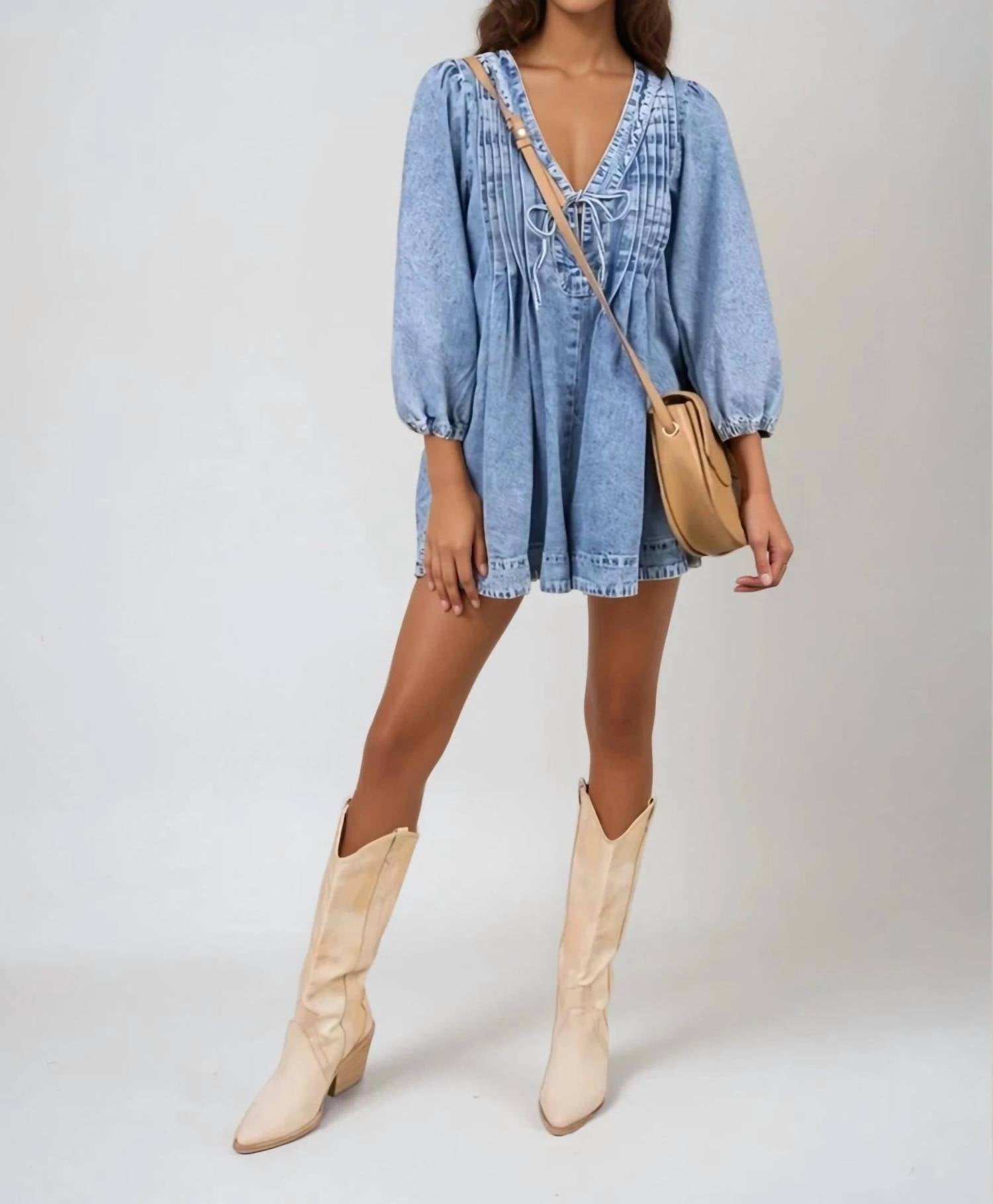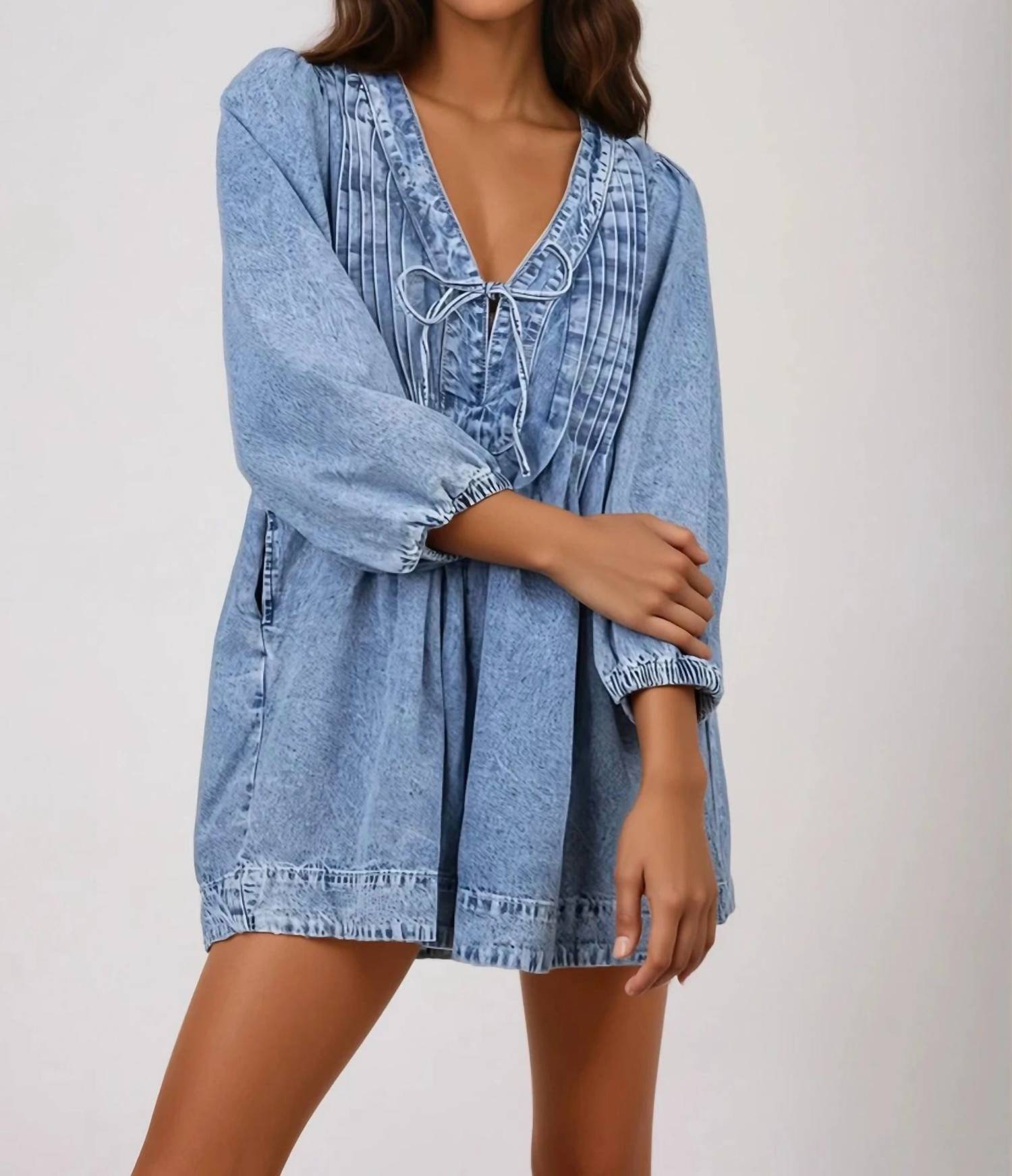 It doesn't take much for this one piece to look effortlessly cool. Add some statement jewelry to dress it up, or throw on some sneakers for a more casual vibe. Introducing the Long Sleeve Webster Denim Romper by Veveret, a chic addition to your summer wardrobe. This blue romper is crafted from 100% cotton in a medium washed denim, featuring functional side pockets and a mini length for a modern look. The design includes a deep v-neck with a string tie closure, pleated detailing, and 3/4 sleeves with elastic cuffs for a touch of sophistication. Care: Machine wash and tumble dry for easy maintenance.