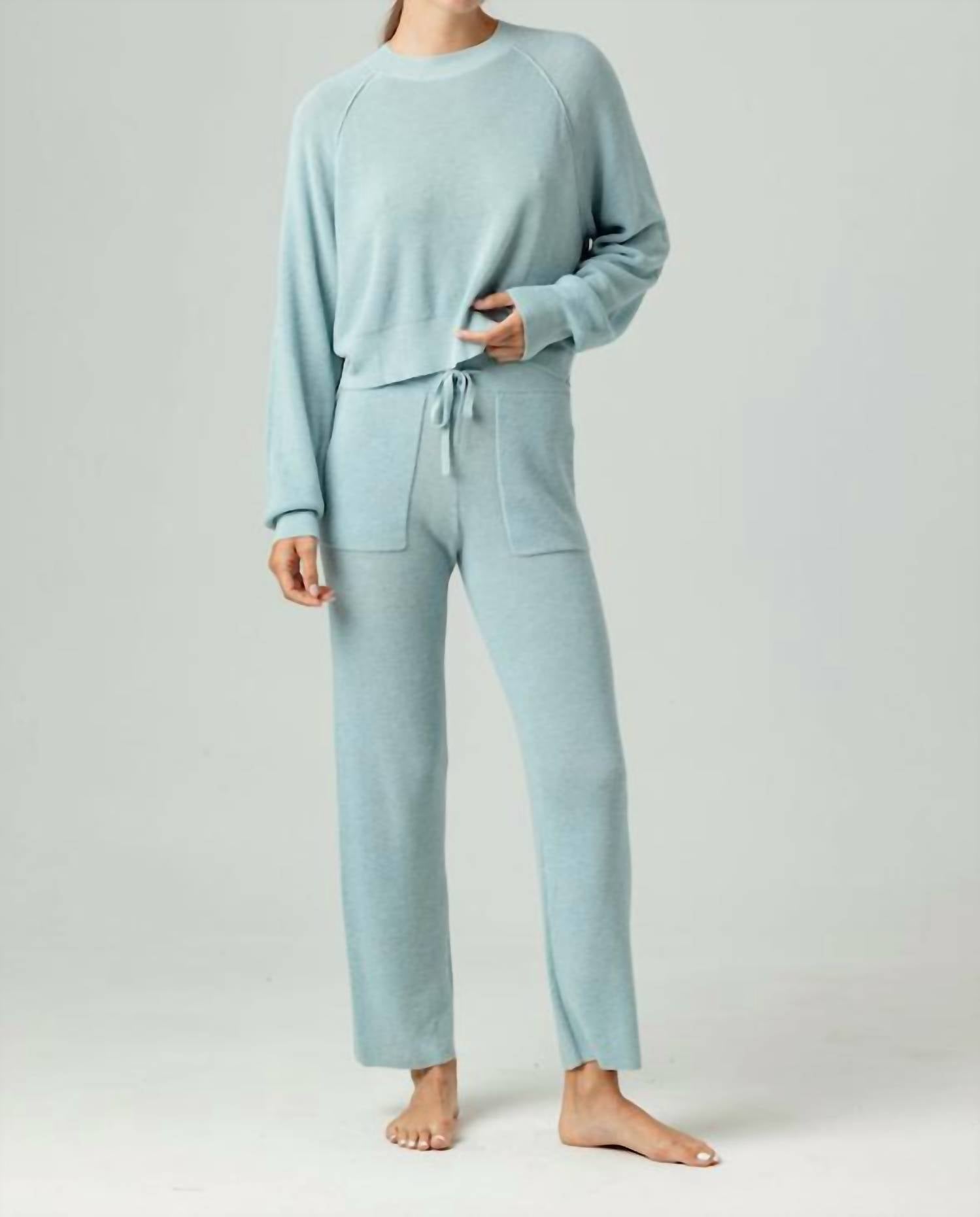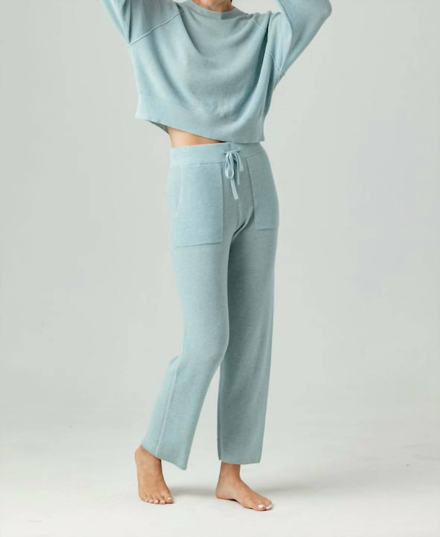 Elevate your lounge attire with the Cole Jogger Pants by Sundays, crafted in Blizzard Blue. These women’s joggers are fashioned from a luxurious blend of viscose, nylon, polyester, and cashmere. Featuring a comfortable elastic waistband with a self-drawstring and practical patch pockets, these full-length straight leg joggers ensure a chic look with a thermal stitch design.