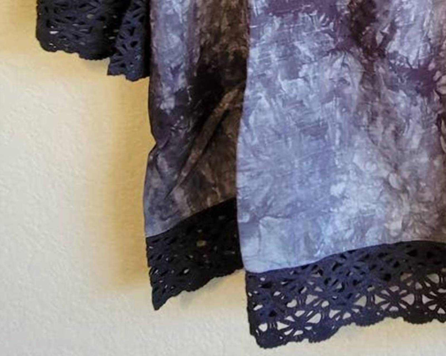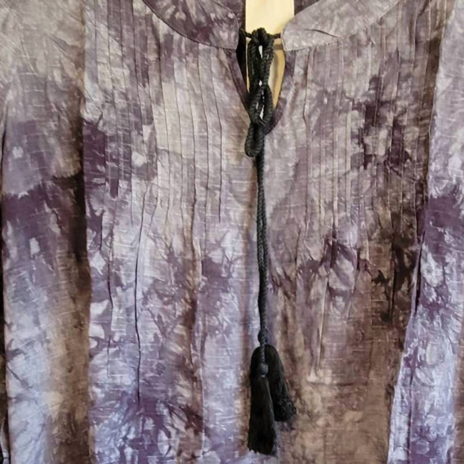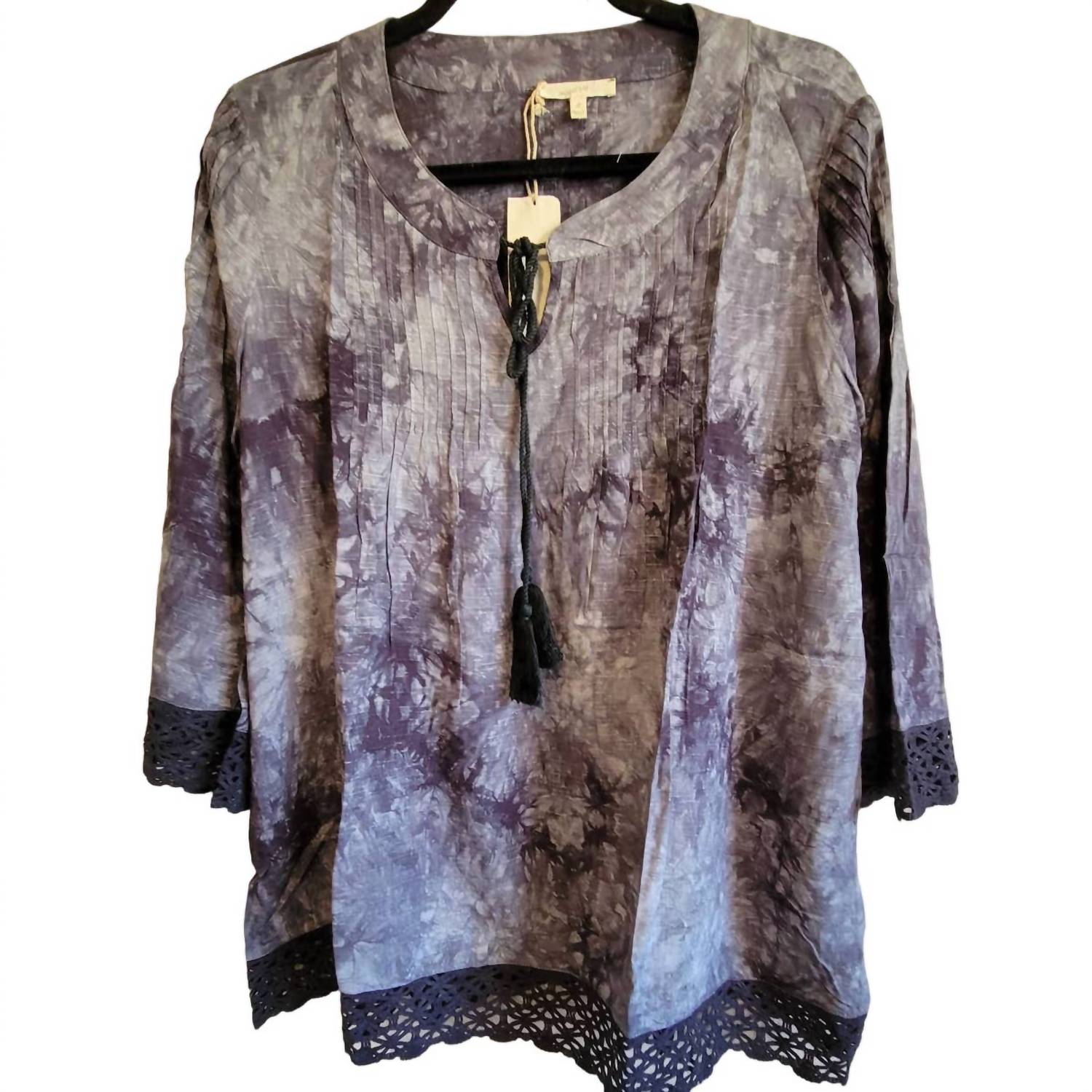 Embrace the versatility of this tunic-style blouse, expertly crafted for seamless layering or perfect to wear on its own. Its detailed design and comfortable fit make it a perfect addition to any closet. This Women's Tie Dye Tunic Top by Mystree offers a blend of bohemian sophistication in a striking navy blue hue. Featuring three-quarter flared sleeves adorned with crochet trim, this tunic adds a playful texture with a pleated placket and tassel tie at the neck. Made from 100% Rayon, its breathable fabric ensures comfort and ease, making it ideal for everyday wear. The tunic's style is uniquely finished with crochet trim at the hemline, combining elegance and casual flair perfectly. Size Small measures 21" pit to pit and 27" from shoulder to hem.