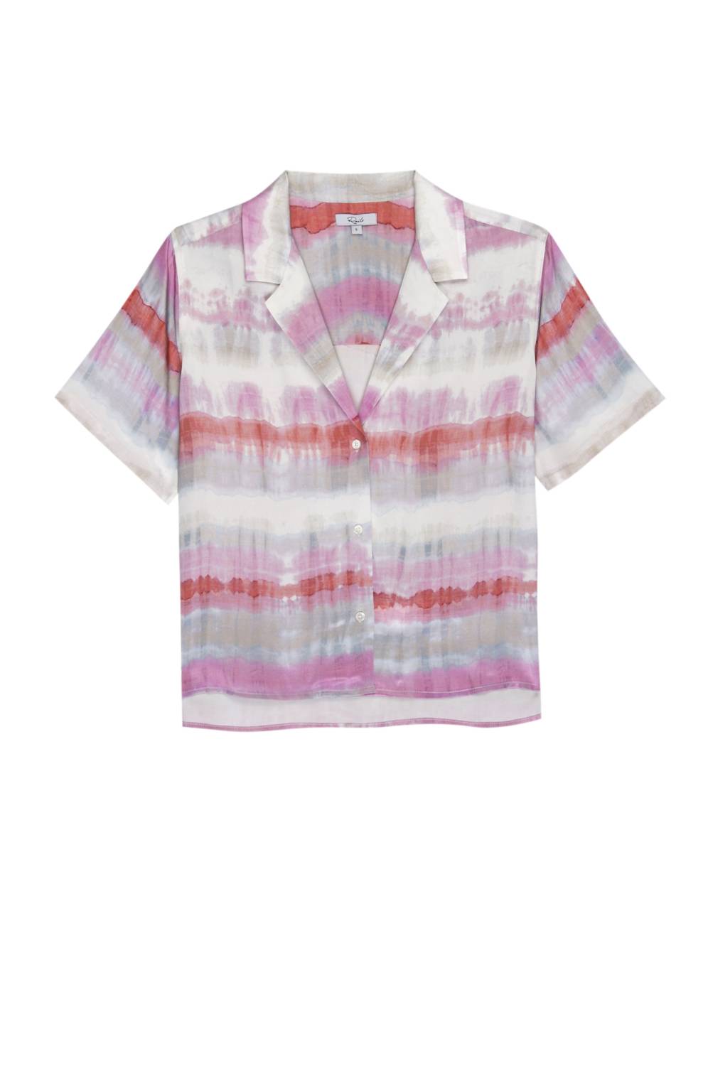 Luxe satin crepe, short sleeve, coral pink buttondown shirt featuring multicolor waves print throughout, relaxed fit, notched collar, and natural shell buttons. 55% Rayon, 45% Viscose. Imported. Dry clean only.