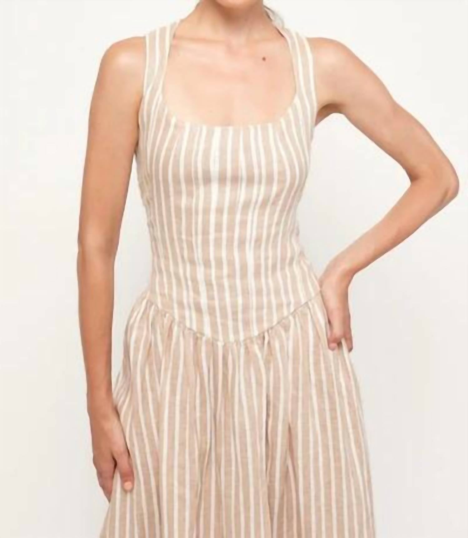 A midi dress so versatile, your options for wearing it are endless. Embrace a chic summer vibe with the Fitted Bodice Midi Dress by S/W/F, designed for effortless elegance. This sleeveless piece features a classic square neckline with wide straps, enhancing the stately Oneway stripe pattern. Made from 100% sustainable linen, its A-line silhouette ensures a flattering fit. Closure: Pull on. Care: Dry clean only. Ideal for adding a polished touch to your warm-weather wardrobe.