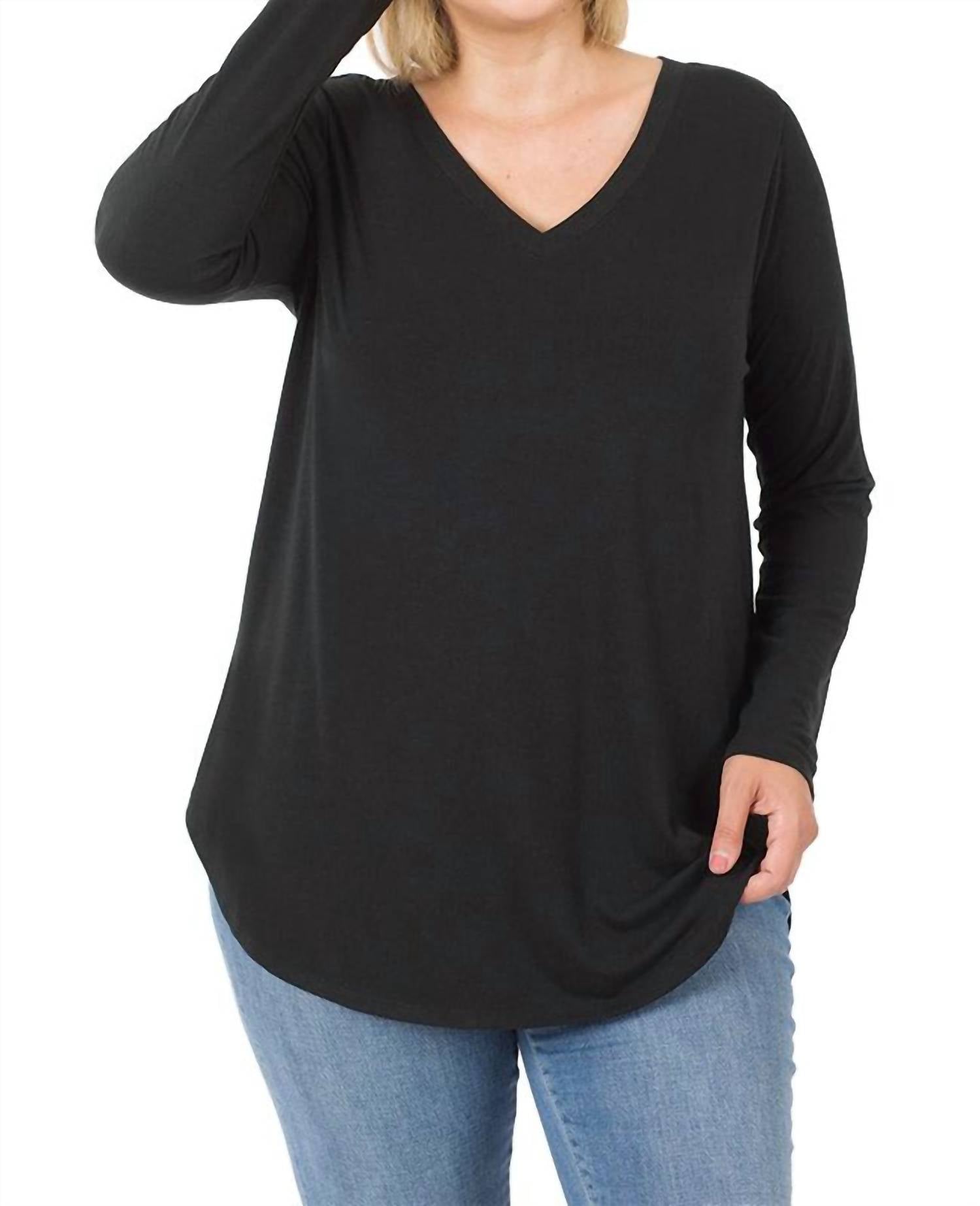 A long sleeve top you can wear with denim, skirts, well... just about anything! Elevate your wardrobe with the Long Sleeve Round Neck Hem Top Plus by ZENANA, a quintessential piece for effortless style. Designed with long sleeves and a flattering V-neckline, this top is crafted from a soft blend of 57% polyester, 38% rayon, and 5% spandex, providing a lightweight and breathable feel. The pull-on closure and relaxed rounded hem make it ideal for both solo wear and layering, transitioning seamlessly from day to night. This solid black top is a minimalist’s dream for any occasion, especially during the spring and Thanksgiving holiday season.