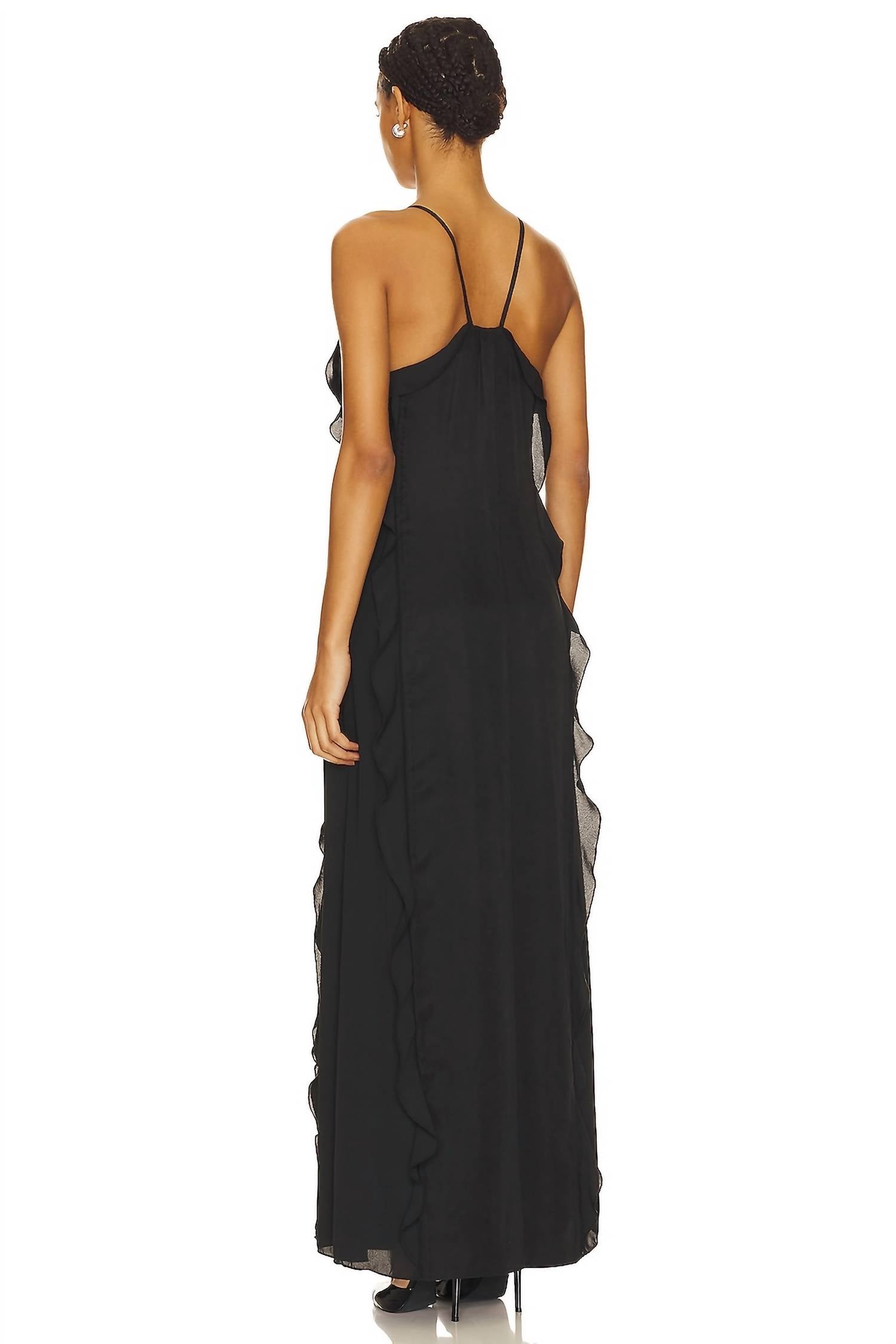 Who doesn't love a good maxi dress? This one you'll be reaching for season after season. This elegant dress combines midweight sateen with chiffon contrast fabric, featuring delicate ruffle trim and a side seam slit for added movement. Fully lined for comfort, it offers easy pull-on styling. Made from a blend of cupro and viscose, with polyester contrast and lining. Dry clean only.