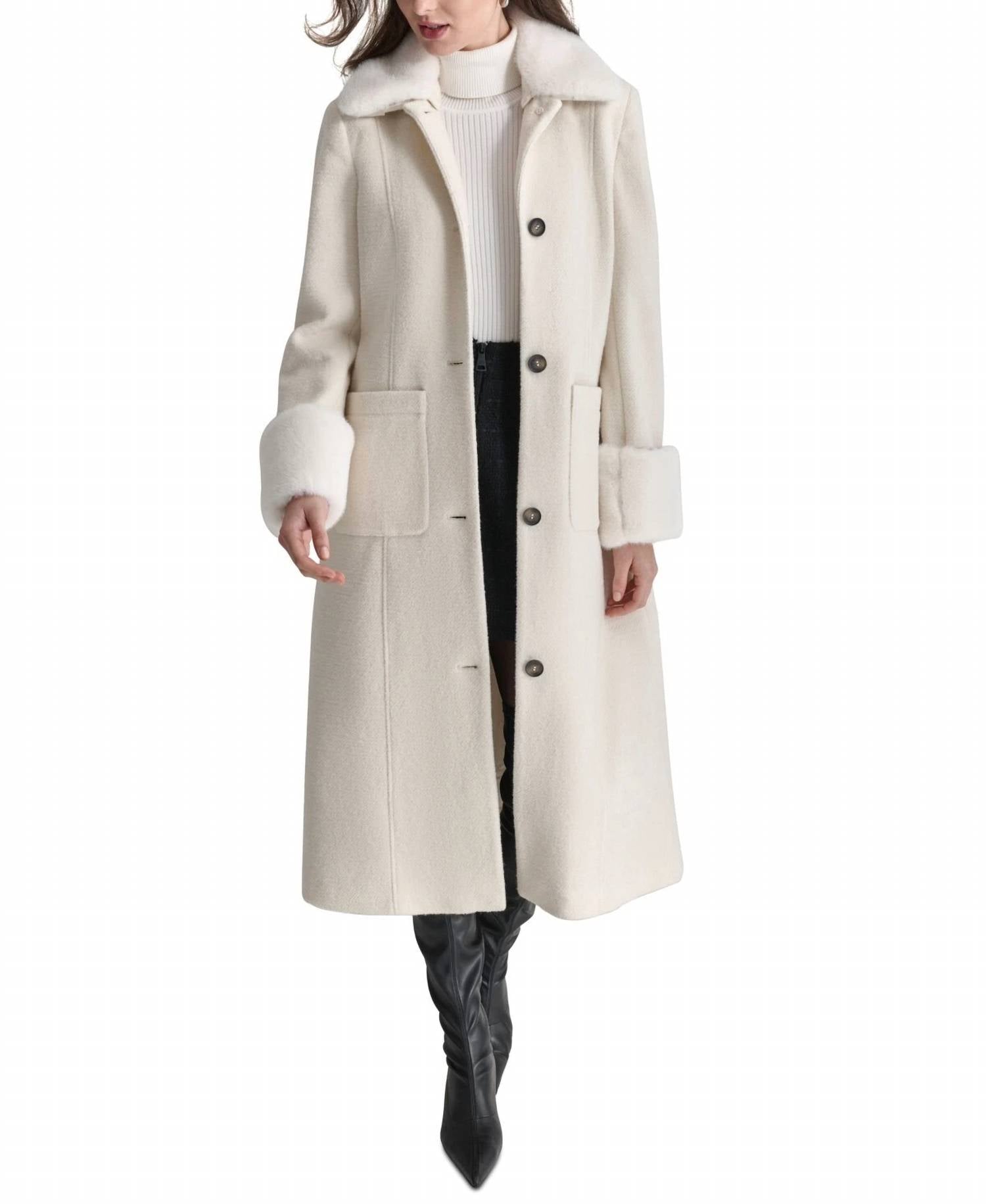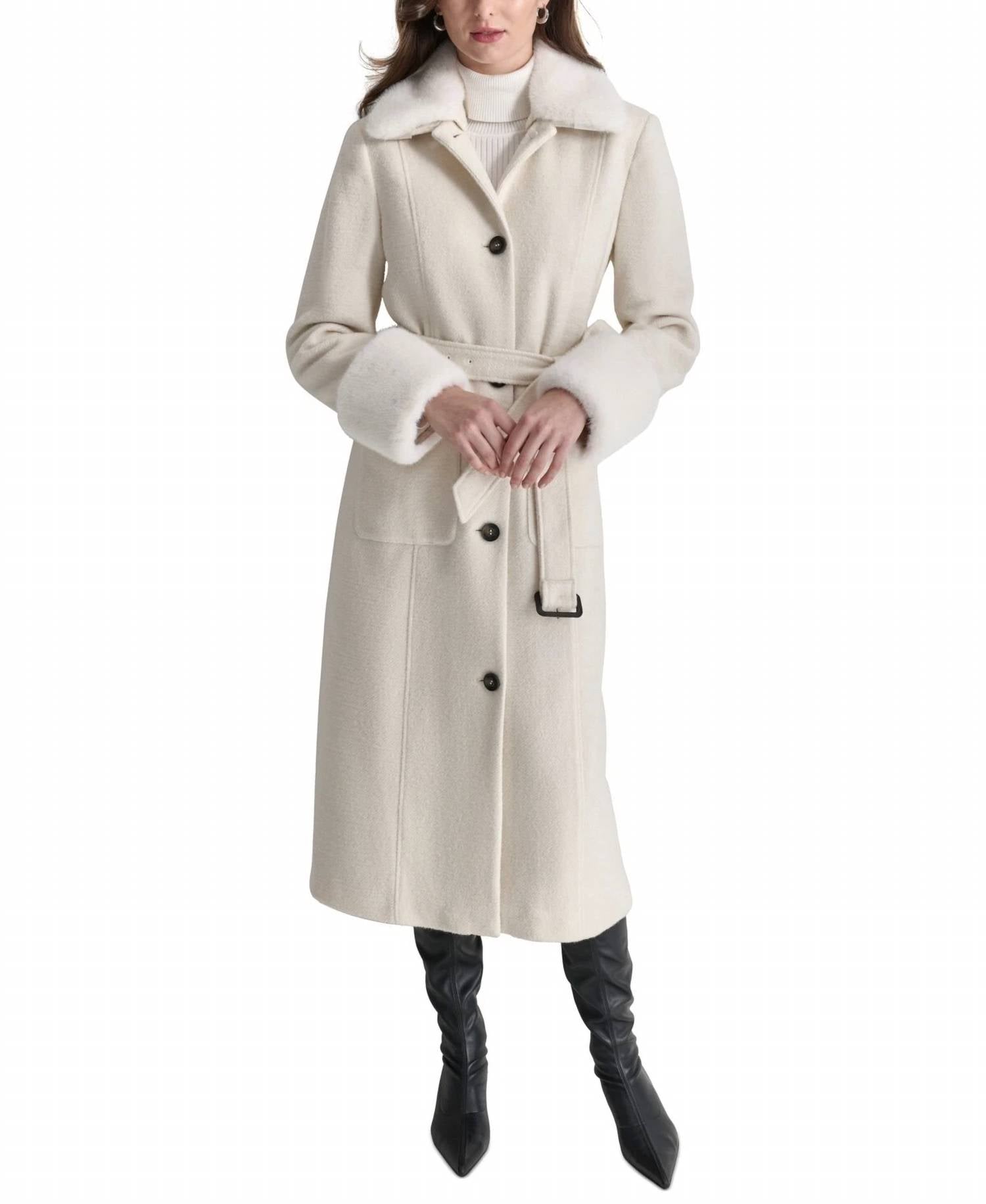 Classicly chic, this is the kind of trench coat that never goes out of style. The DKNY Faux Fur Trim Single Breasted Belted Coat is an elegant addition to your winter wardrobe, offering both style and warmth. This long sleeve trench coat, crafted from a premium 50% wool and 50% polyester blend, comes in a sophisticated pearl color. Featuring a removable faux-fur trim at the collar and cuffs, and a detachable waistline belt for personalized styling. Keep your essentials secure with patch pockets at the side front. Closure: Button closure. Care: Dry clean only. Length: 51 inches.