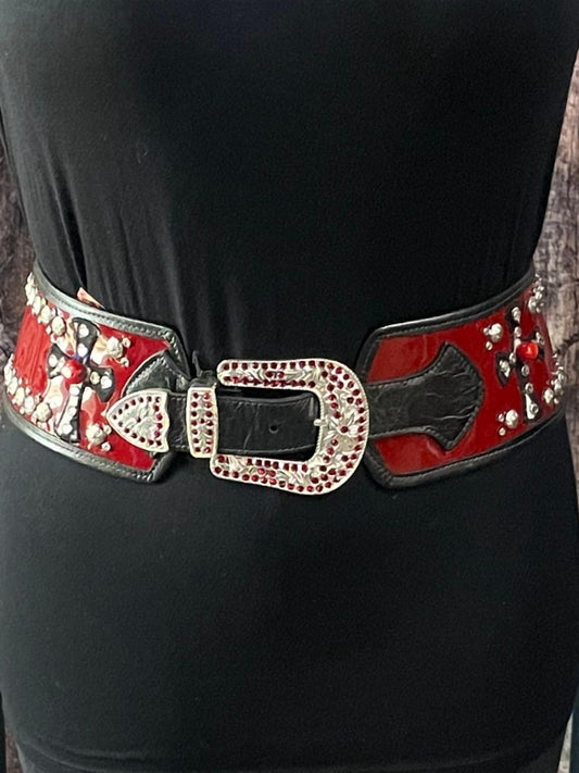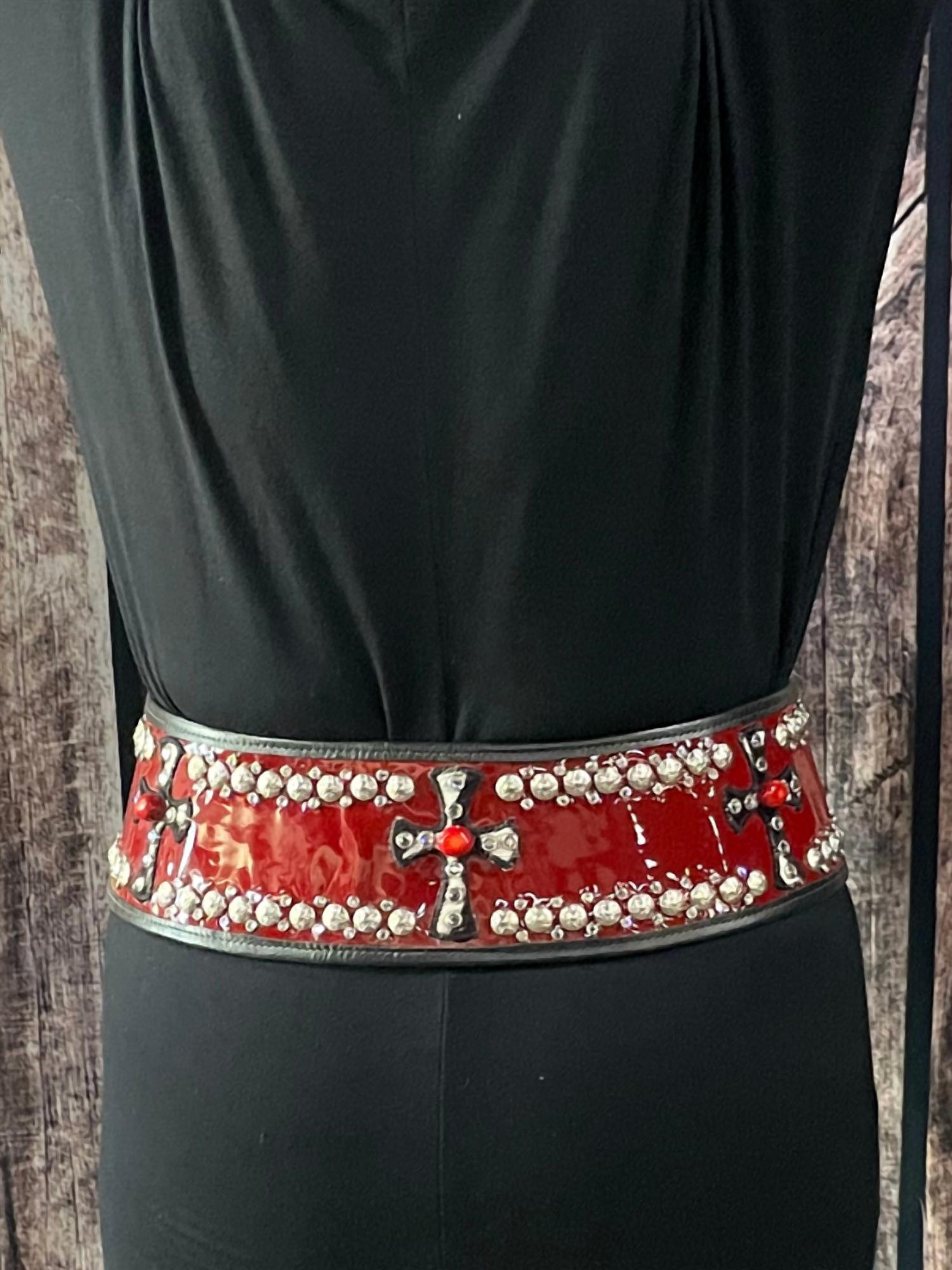 Red Cross Belt that has patton leather. Swarovski crystals throughout the belt with hide in the cross.