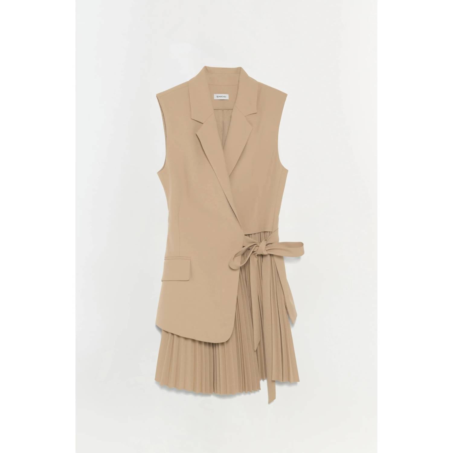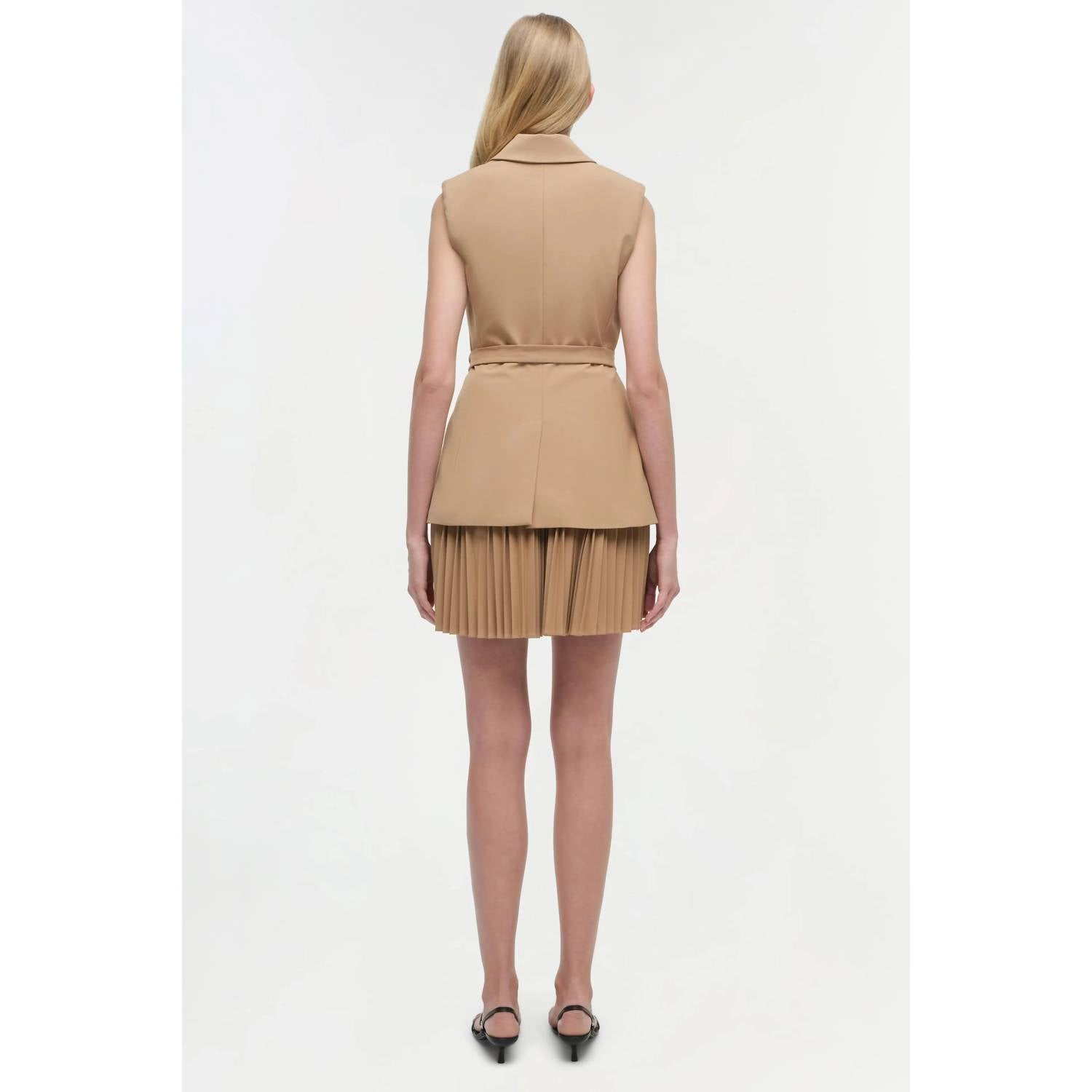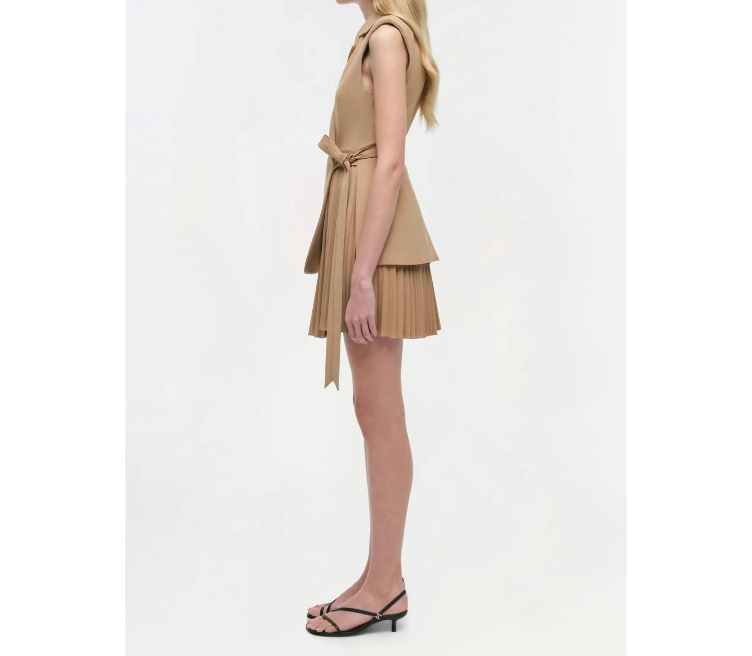 The perfect mini dress for those warmer months. Camel-hued, sleeveless dress perfect for spring's evening events. Solid, A-line silhouette boasts an asymmetrical, blazer-esque upper with a chic V-neckline and a side tie closure, revealing a finely pleated skirt. Conveniently designed with a flap side pocket, offers a fully lined interior and is composed of polyester. For care, either machine wash or opt for dry cleaning to maintain its quiet luxury. Model is 5'10" and wears a size 2.