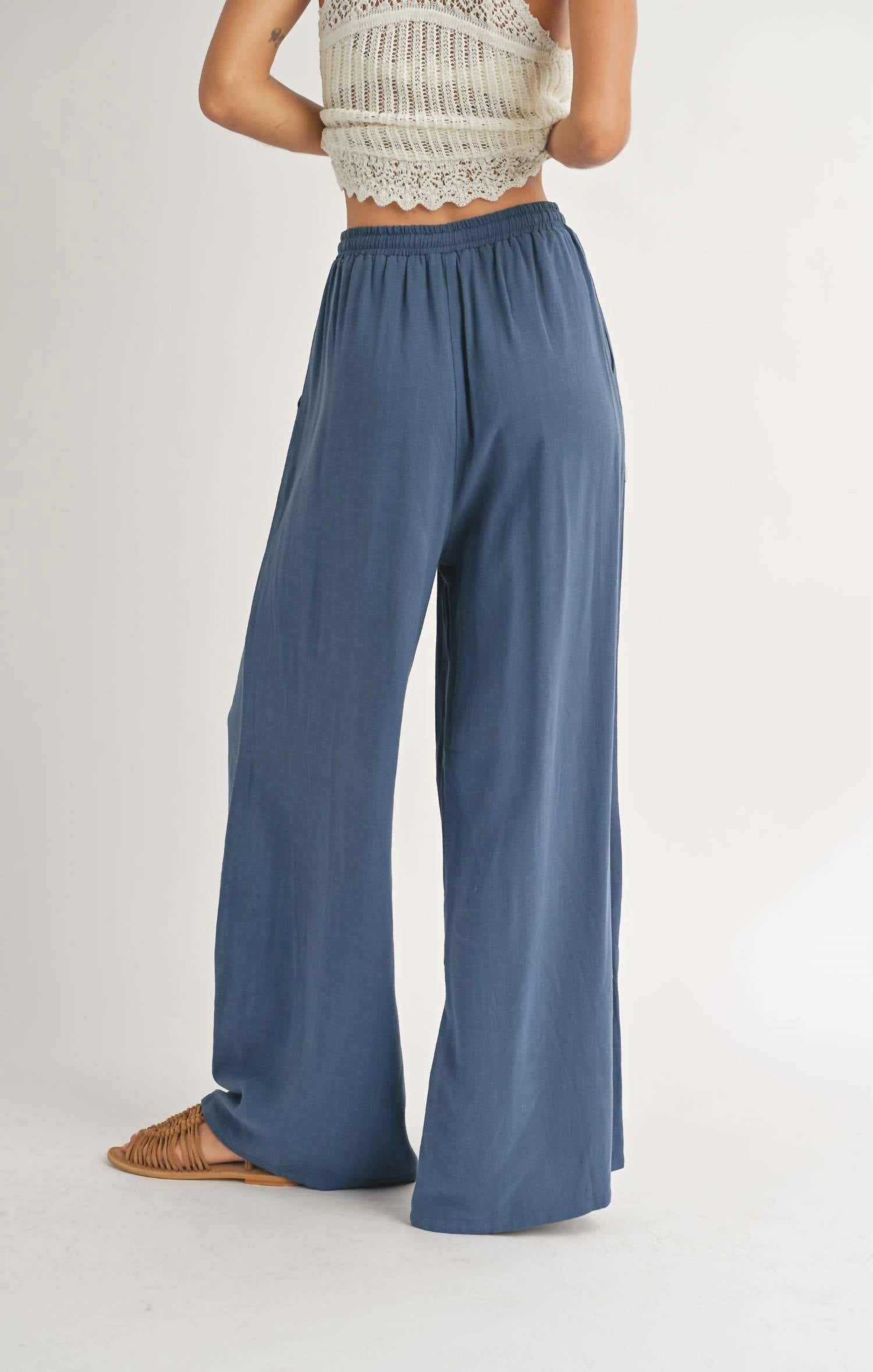 Elastic waistband with drawstring. Side pockets. High waisted. Wide leg. Full-length pant made with lightweight, breathable knit fabric. 70% rayon, 30% linen.