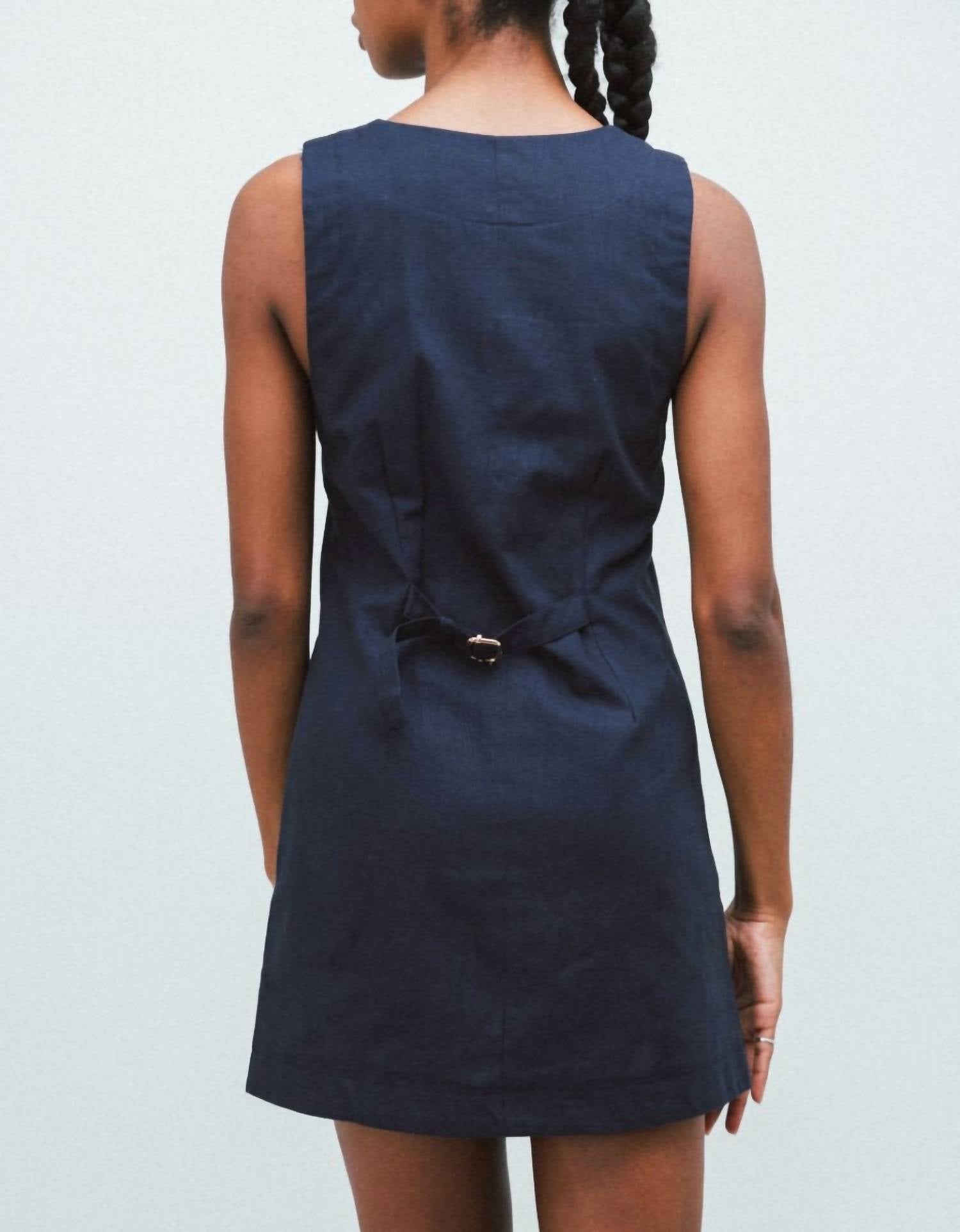 A short and breezy dress for those warmer days. Introducing the Button-front Dress by OLIVACEOUS, a chic navy dress perfect for minimalist styling. This sleeveless, bra-friendly shift dress is crafted from a high-quality linen blend and features a button closure with functional tortoise buttons. The mini-length silhouette includes practical front pockets and an adjustable gold belt buckle at the back to tailor the waist fit. Care instructions recommend hand washing and laying flat to dry, ensuring longevity for your spring wardrobe.