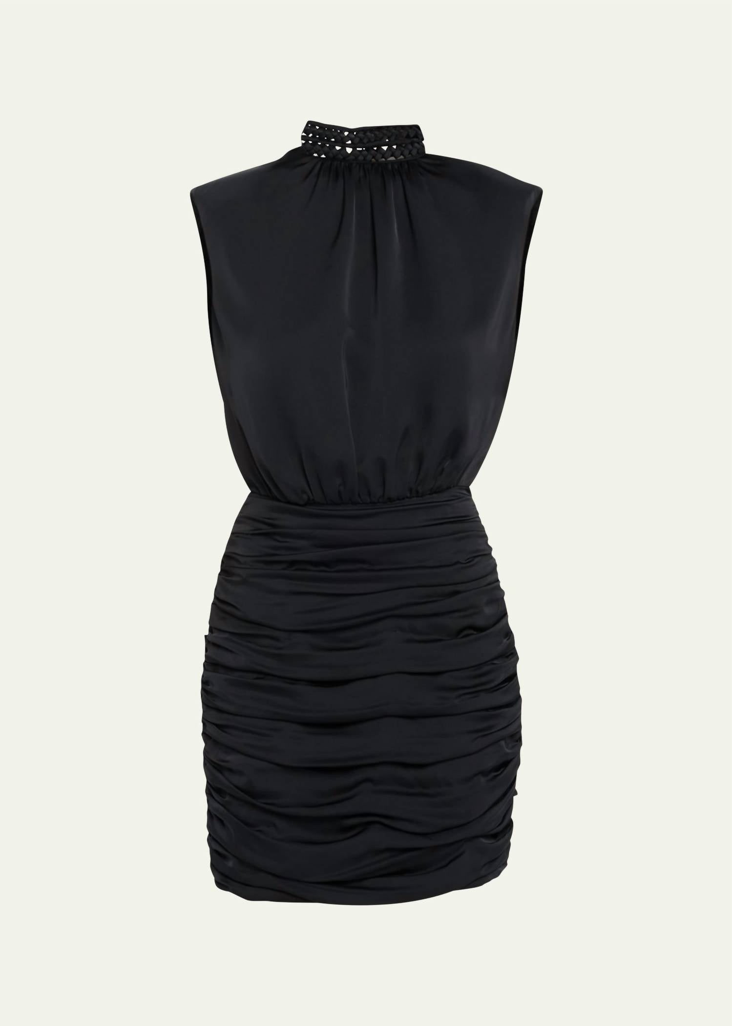 A short and breezy dress for those warmer days. This sleeveless mini dress is designed in a shift silhouette with a textured finish for subtle dimension. Featuring a sophisticated mockneck, it offers a chic yet comfortable fit that transitions effortlessly from day to night.